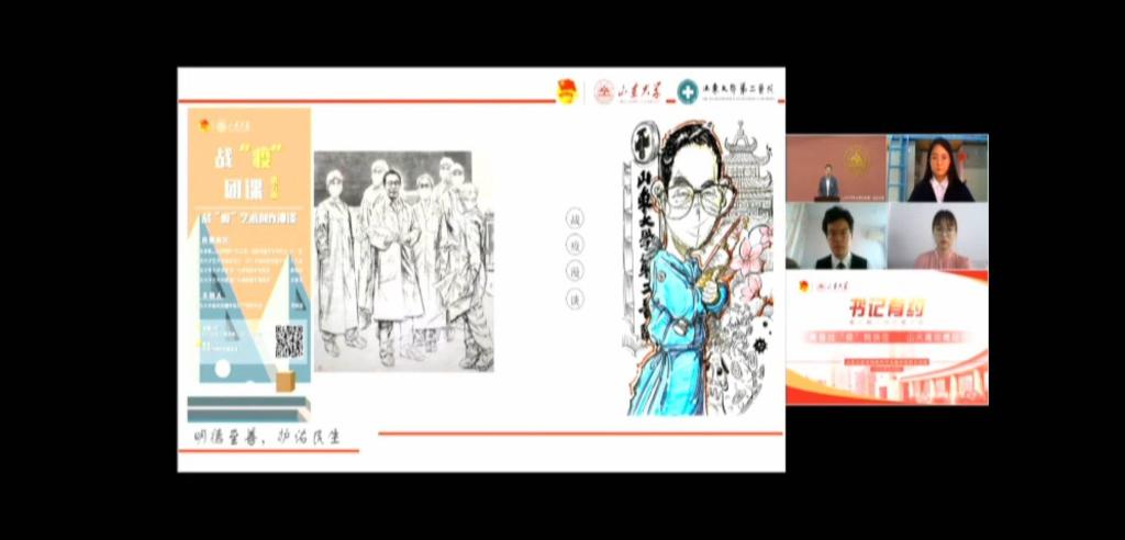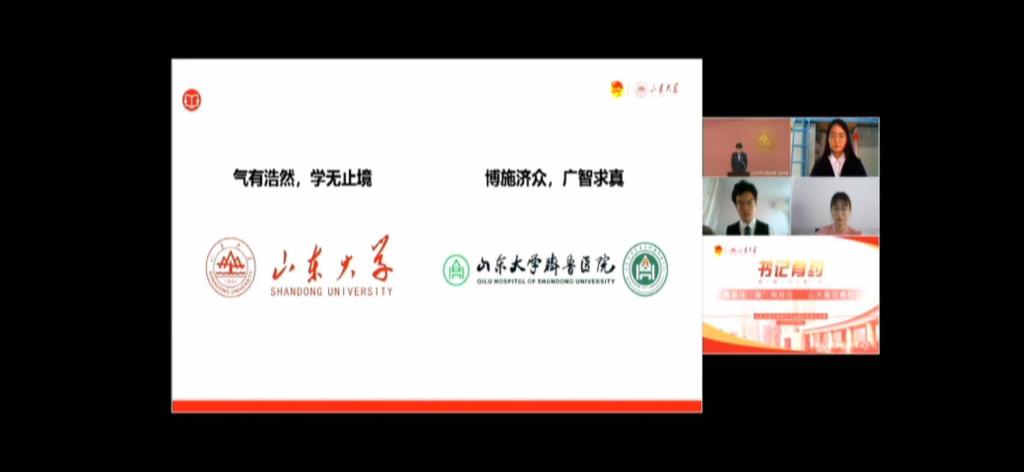 接着,来自学校各单位的9位青年师生及医务员工代表在会上畅谈学习体会,讲述了他们的战“疫”故事。三位援鄂医疗队青年代表,齐鲁医院重症医学科主管护师郭丙秀、齐鲁医院呼吸与危重症医学科主治医师季翔和第二医院重症医学科护师宋淳分享了他们亲赴前线,不惧危险,用自己的生命抵挡病毒蔓延的故事。三位青年教师代表展示了疫情期间投身学术和教育事业的成果:药学药物化学研究所副教授展鹏投身药物研发,国际教育学院副教授孙雪霄认真筹备线上教学,化学与化工学院团委书记张洁尽心尽力地服务学生。三位青年学子代表分享了自己的战“疫”经历与感受:留校的威海校区法学院硕士研究生李亚兰积极配合学校工作,有序安排在校的学习生活;来自湖北的政治学与公共管理学院硕士研究生孟鑫作为在鄂临时团支部成员,在学校师生的鼓励下,坚定信心,勇敢面对疫情,并表示期待早日回校与老师同学相见;参与志愿服务的外国语学院本科生马文啸,抗击疫情期间参与了诸多志愿服务活动,成为青年人的榜样。他们都是当代青年人勇敢担当的最好例证,展现了山大青年顾全大局、与国家同呼吸共命运的胸怀,以及新一代优秀青年学以致用、发挥己长、积极担当、贡献社会的精神。