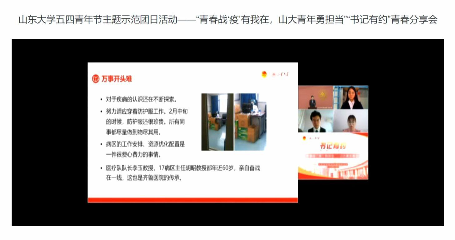 5月4日上午,在五四运动一百零一周年之际,我校举办了“书记有约”青春分享会暨“青春战‘疫’有我在,山大青年勇担当”主题示范日活动,学习抗疫先进事迹,砥砺青年奋进担当。活动通过云平台在线直播,248cc永利集团组织全体学生参与并观看了活动直播。校党委书记郭新立、党委副书记王君松出席了活动。