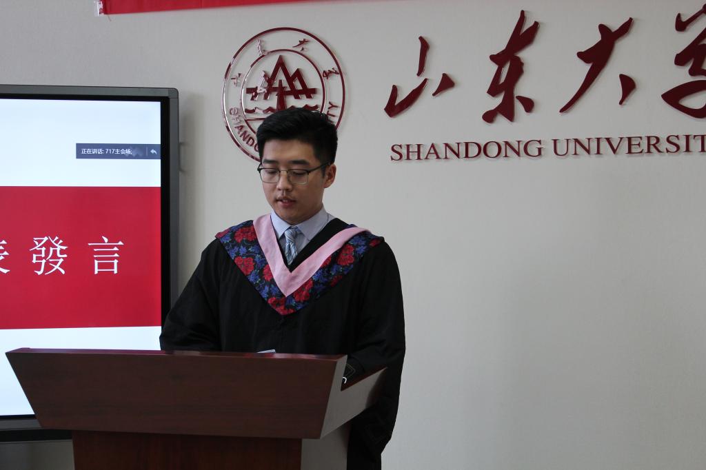 接着,教师代表黄发有教授为同学们送上毕业祝福。他勉励大家学会选择,学会承担,坚持自己的原则,去追逐“诗与远方”。他希望大家努力成为人格健全的人,尊重自己,尊重他人,有情怀,有格局,有担当,发光发热,温暖自己,照亮他人。他还结合曾繁仁老师、黄万华老师、杜泽逊老师热爱、坚持教学与科研的实例指出:平凡中的坚持与积累,这是山大文学院的优秀传统。他希望在未来的学习、工作、生活中,文院精神能陪伴同学们走出暂时的困惑,踏踏实实,勇往直前。最后,他借聂鲁达的散文诗《永不停航的船》,深情祝福毕业生在奋斗的旅程上一帆风顺,用寻美的眼去欣赏人生的沿途风景,用感恩的心去迎接每一次日出。