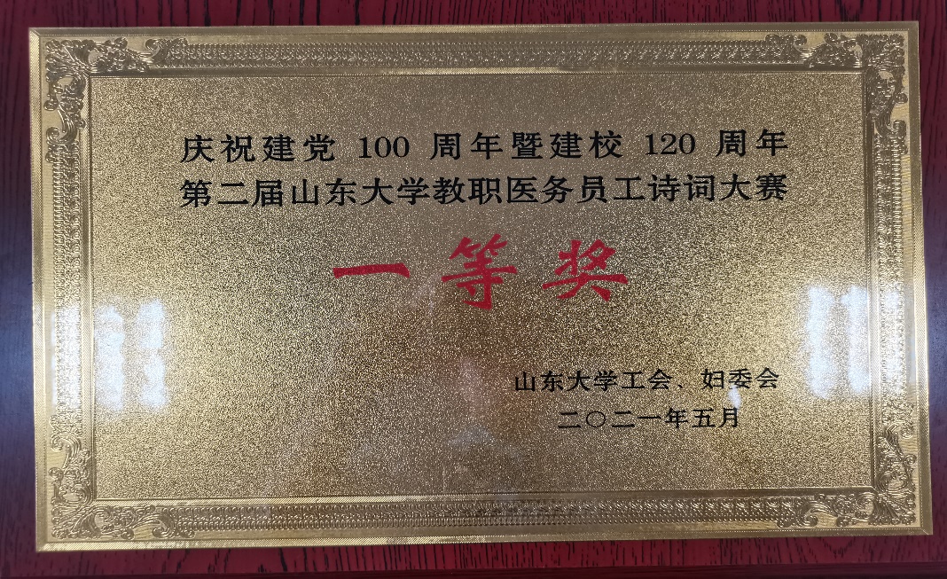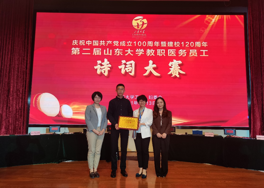 2021年5月13日,在山东大学举办的“庆祝中国共产党成立100周年暨建校120周年第二届山东大学教职医务员工诗词大赛”决赛中,248cc永利集团工会在吉颙老师带领下,由赵鑫、寇鑫、肖映萱三位年轻教师组成的代表队表现突出,不负众望、摘得桂冠。