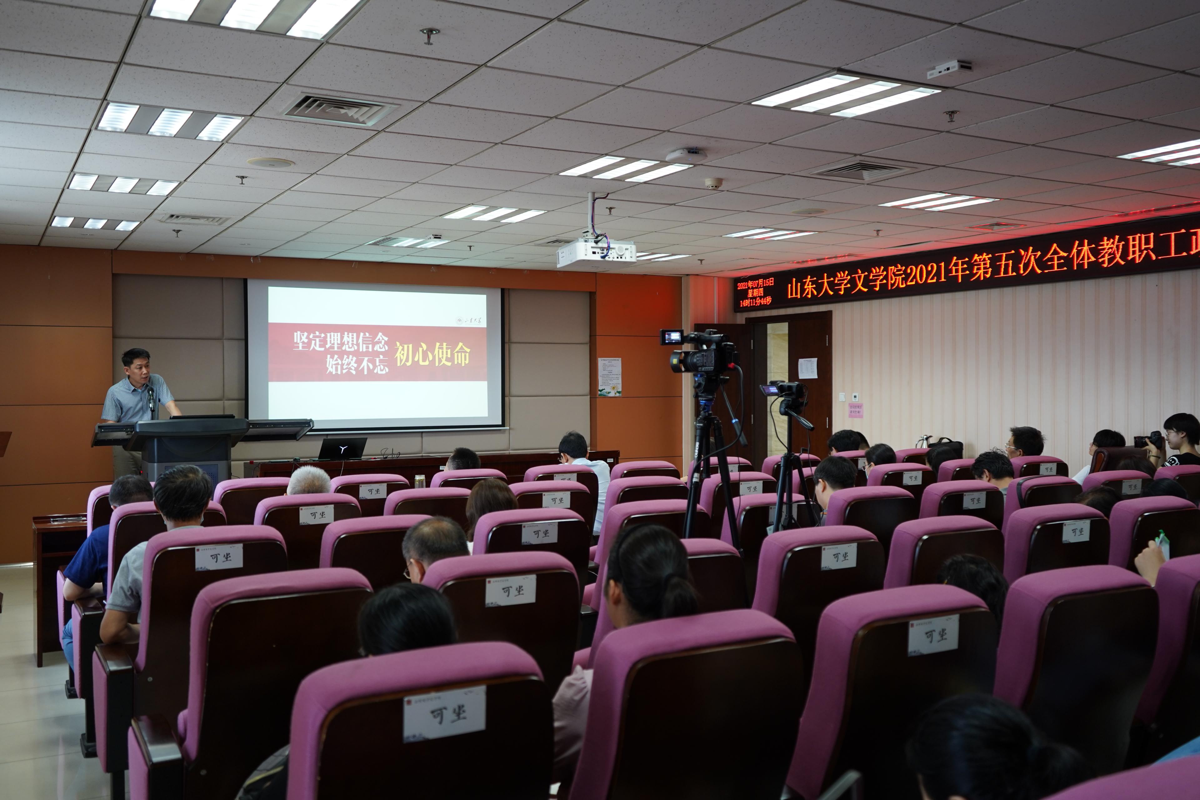 张帅首先带领与会人员学习了习近平总书记在庆祝中国共产党成立100周年大会上的重要讲话精神。他认为,“以史为鉴、开创未来”的思想方法和实践要求是我们学习此次“七一”讲话精神的重要抓手。回顾百年奋斗的光辉历程,中国共产党团结带领人民,不畏强敌、不惧风险、敢于斗争、勇于胜利,始终坚定理想信念,不忘初心使命。百年前的先驱们创建了中国共产党,“坚持真理、坚守理想,践行初心、担当使命,不怕牺牲、英勇斗争,对党忠诚、不负人民”的伟大建党精神就此形成。张帅强调,我们同样要将伟大建党精神作为涵养新时代山大精神和山大文化的精神之源,全体教职工应继承光荣传统,赓续红色血脉,秉承实事求是的优良传统和工作作风,为实现中文“A+”学科的目标而只争朝夕、艰苦奋斗。他勉励文学院全体教职工要积极主动把握习近平总书记“九个必须”的精髓要义,明确其实践要求;落实到思想和行动上,就是要以立德树人为根本,擦亮“教育报国”和“为国育贤”的办学初心,彰显“重情义、尚风骨、尊学术”的文院品格,为建设担当中华民族复兴大任的世界一流大学做出应有贡献。