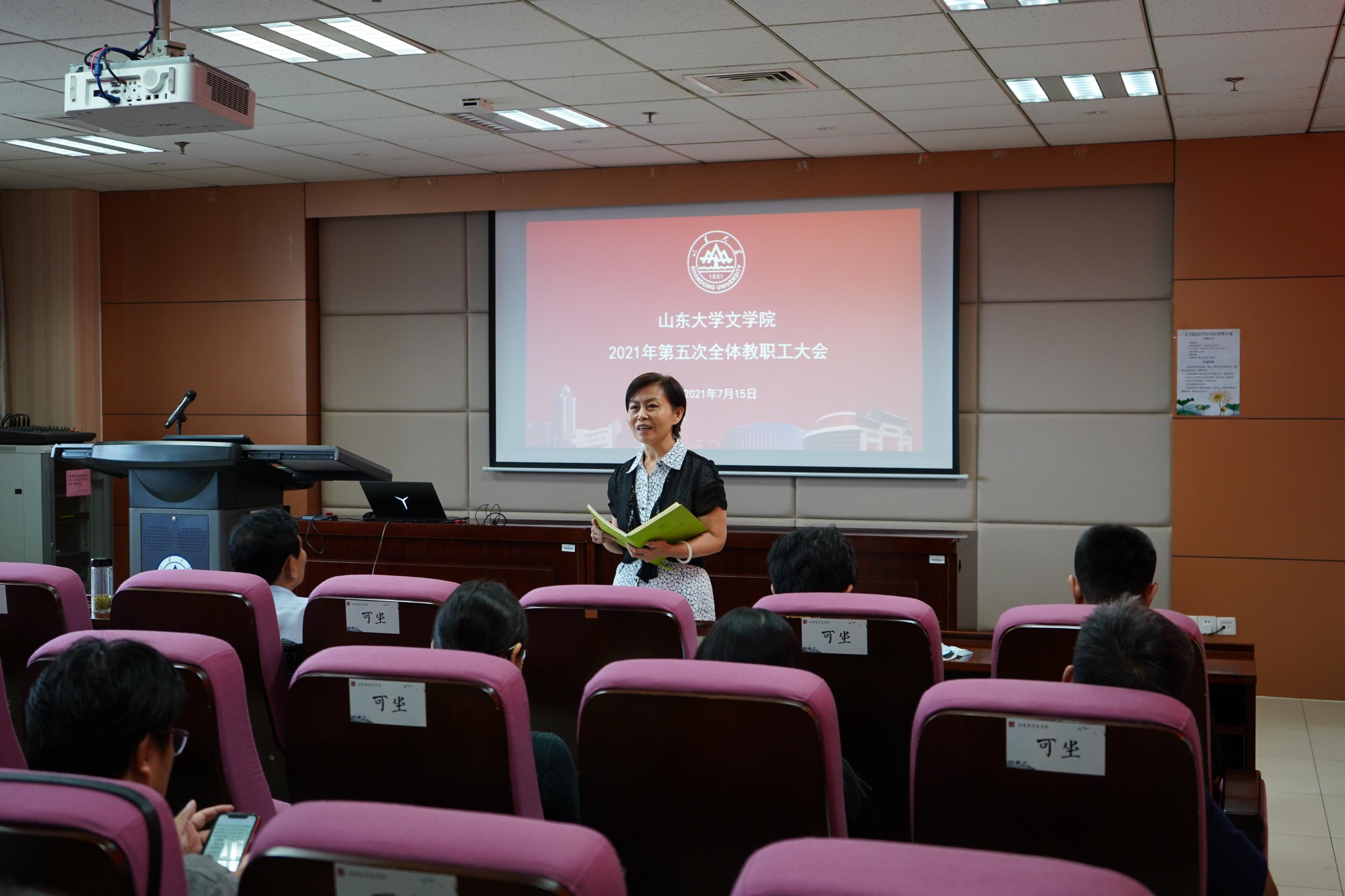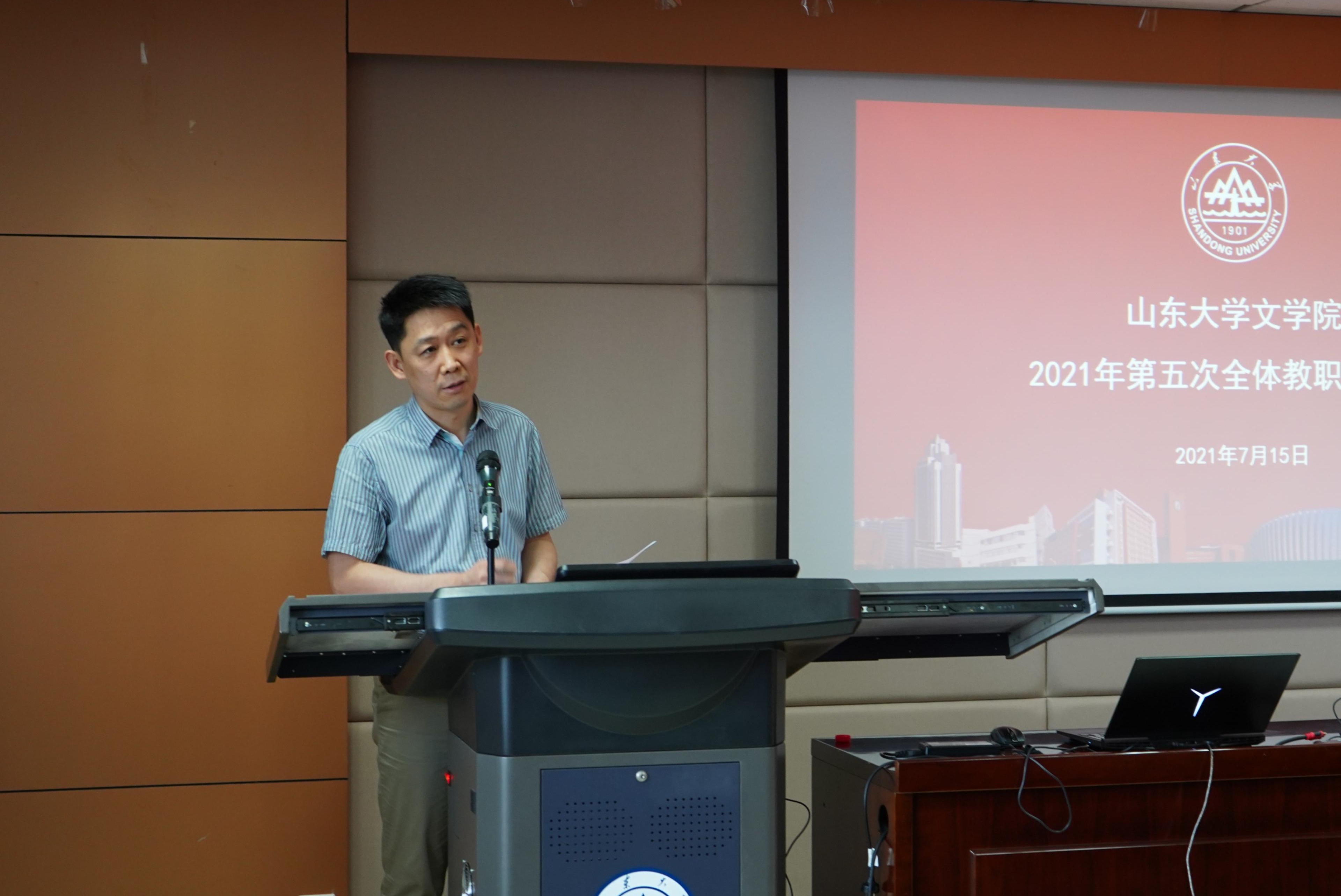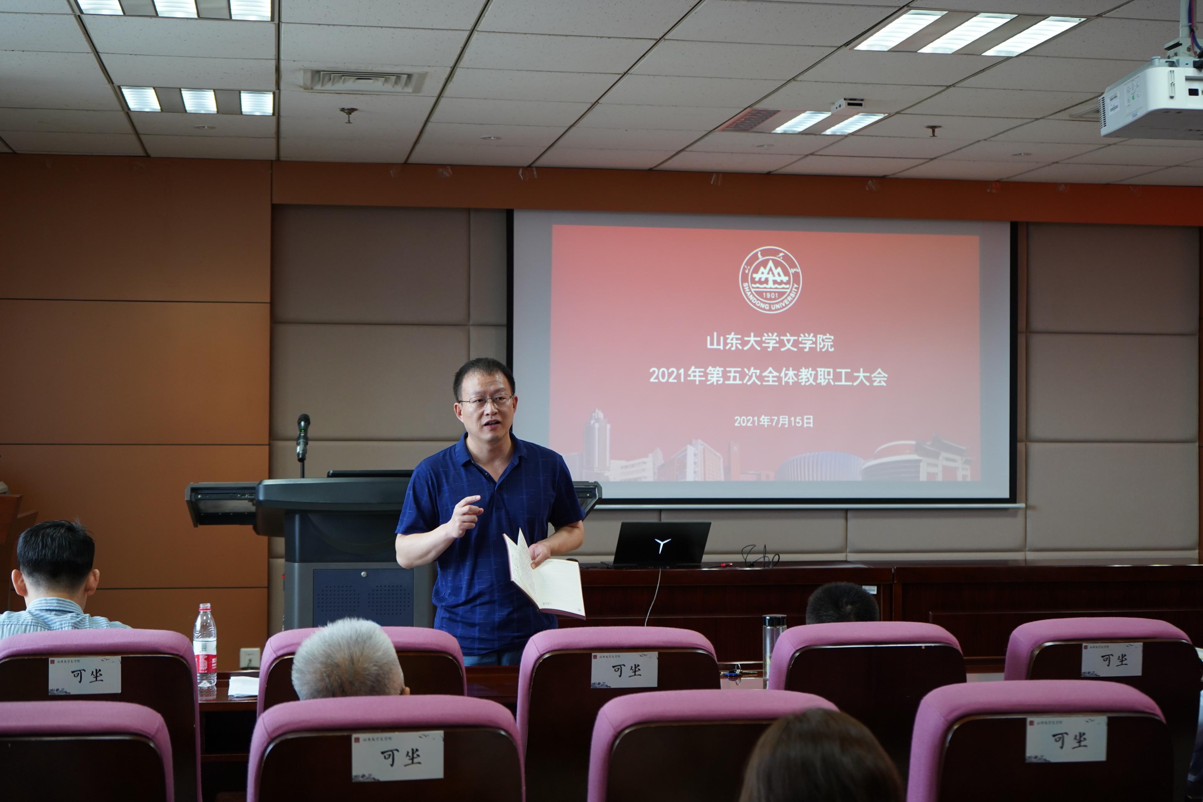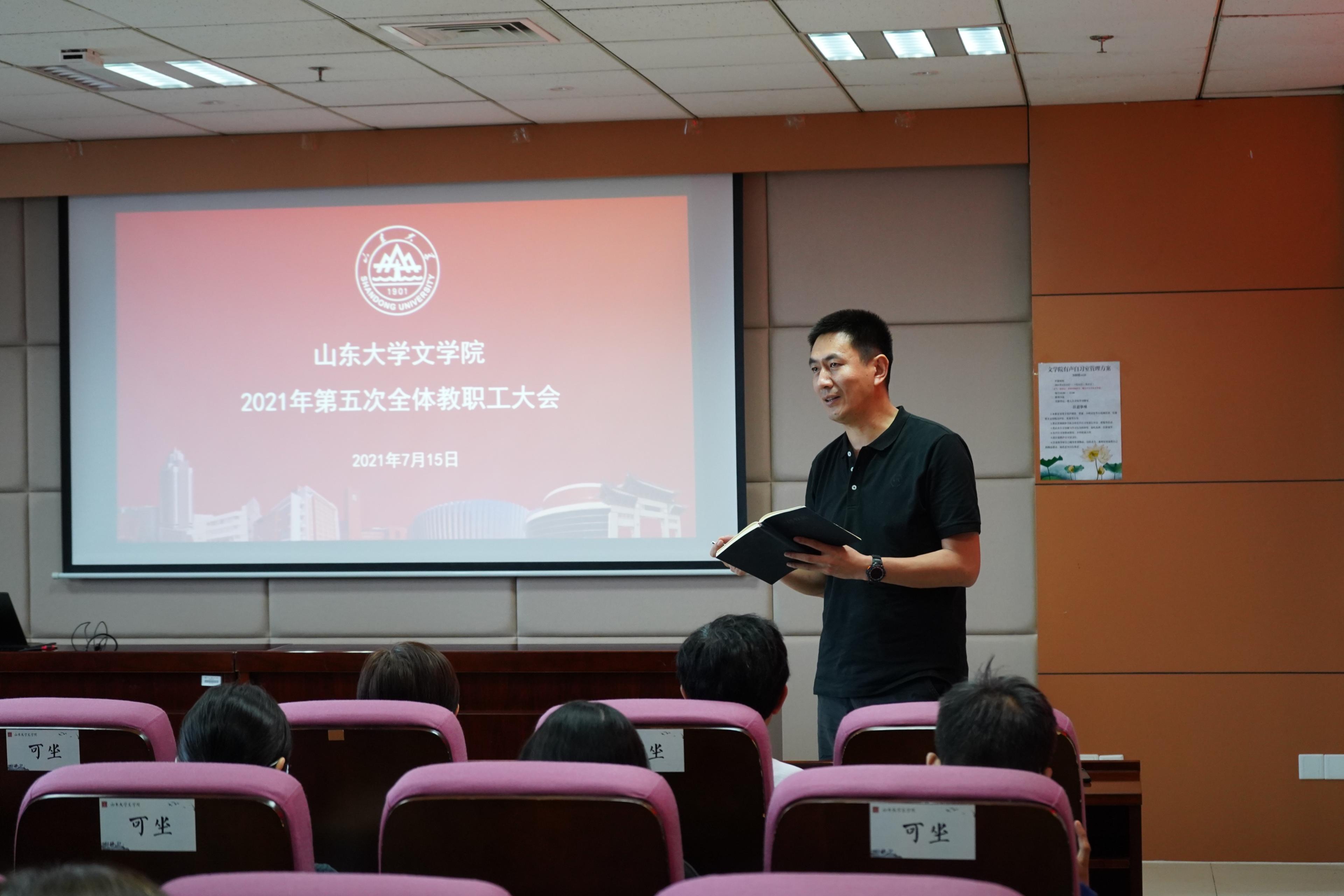 最后,张帅进行总结发言。他分别介绍了袁世硕、郭延礼、龚鹏程、杜泽逊等几位老师在编订优秀教材方面取得的丰厚成果,以及杜泽逊、张燕芬两位老师在打造思政示范课程方面的杰出成果,对各位老师的学术成就和突出贡献表达了敬意和赞扬。同时对寇鑫荣获山东省高校青年教师讲课比赛一等奖、杨俊娇荣获山东省高层次人才服务工作先进个人予以充分肯定。张帅表示,这些老师的突出表现彰显了学院的学科实力和学术底蕴,体现了文院教师的责任担当与奉献精神,扩大了文院良好声誉,全体教职工要向身边的优秀老师学习,积极投身于“A+”一流中文学科建设,在建设担当中华民族复兴大任的世界一流大学的征程上挺身在前、彰显担当、贡献力量。张帅进一步向大家强调了高校思想政治工作的重要作用。他表示,高校思想政治工作关系到高校培养什么样的人、如何培养人以及为谁培养人这个根本问题,关系到国家政治安全与社会稳定。高校教师要担当起学生健康成长的指导者和引路人的责任,直面现实矛盾和突出问题,旗帜鲜明地抓紧抓好学生思想政治教育工作。全体教职工要坚持把立德树人作为中心环节,努力把思想政治工作贯穿教育教学全过程,在推进“三全育人”到岗、到位、到家上持续下工夫、抓实效。学院要把思想政治工作当作全面加强党的领导、推动学院各项事业发展的重要抓手,推动理想信念教育常态化制度化,更加注重以文化人、以文育人,构建“大思政”格局。