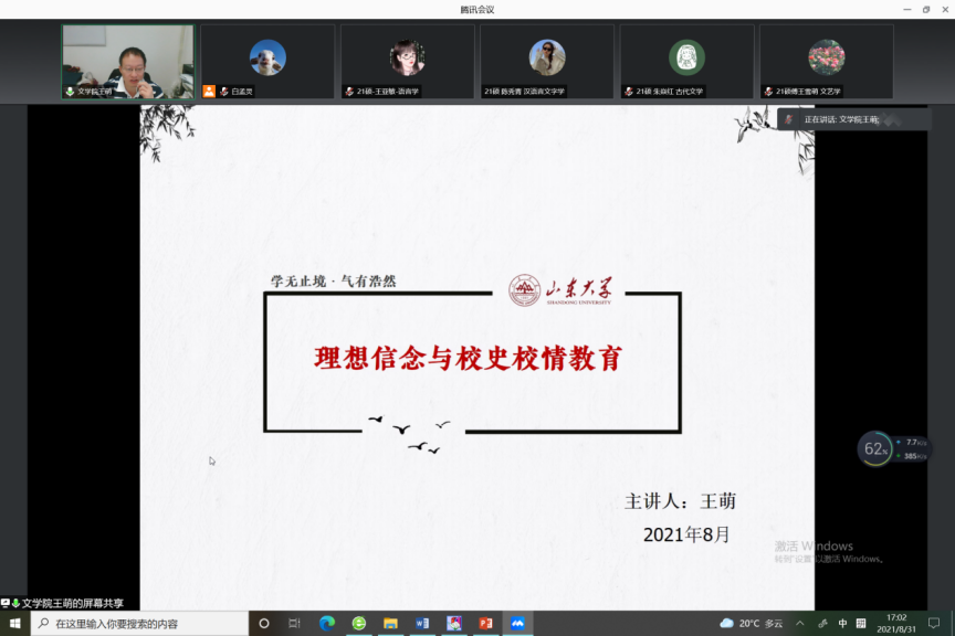 8月31日下午,在山东大学百廿校庆即将来临之际,为明确学生对于学校和学院的历史认知,进一步提高新生对院校的认同感、归属感、荣誉感,增强作为山大文院人的自信,248cc永利集团了2021级研究生理想信念与校史校情教育活动。此次活动以线上会议形式开展,由学院党委副书记王萌主讲,2020级硕士班班长白孟灵主持。