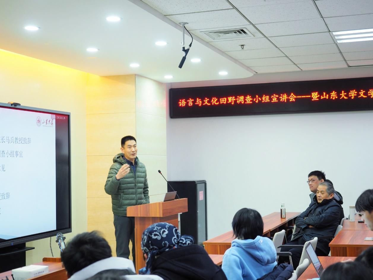 宣讲会伊始,马兵教授结合莫言小说口传文化研究、《海上花列传》方言写作的例子,从三个方面介绍了语言与文化田野调查小组建立的初衷。一是正所谓“读万卷书,行万里路”,目前文学院具备规模的读书会主要在于专业书籍的精读研究,而调查小组则注重在实践中培植学生专业素养;二是文学院历来注重学生全面发展,该调查小组的探索为将来在学生培养计划中设置实践类课程奠定初步基础;三是通过实地调查记录方言和民俗,保护语言文化的多样性,服务国家语言战略。他讲到,学院拥有先进的实验室设施、调查采录设备,配备学术理论扎实与调查经验丰富的专业指导老师,为广泛开展调查研究提供了硬件和师资保障,希望广大同学们给予支持、积极参与。