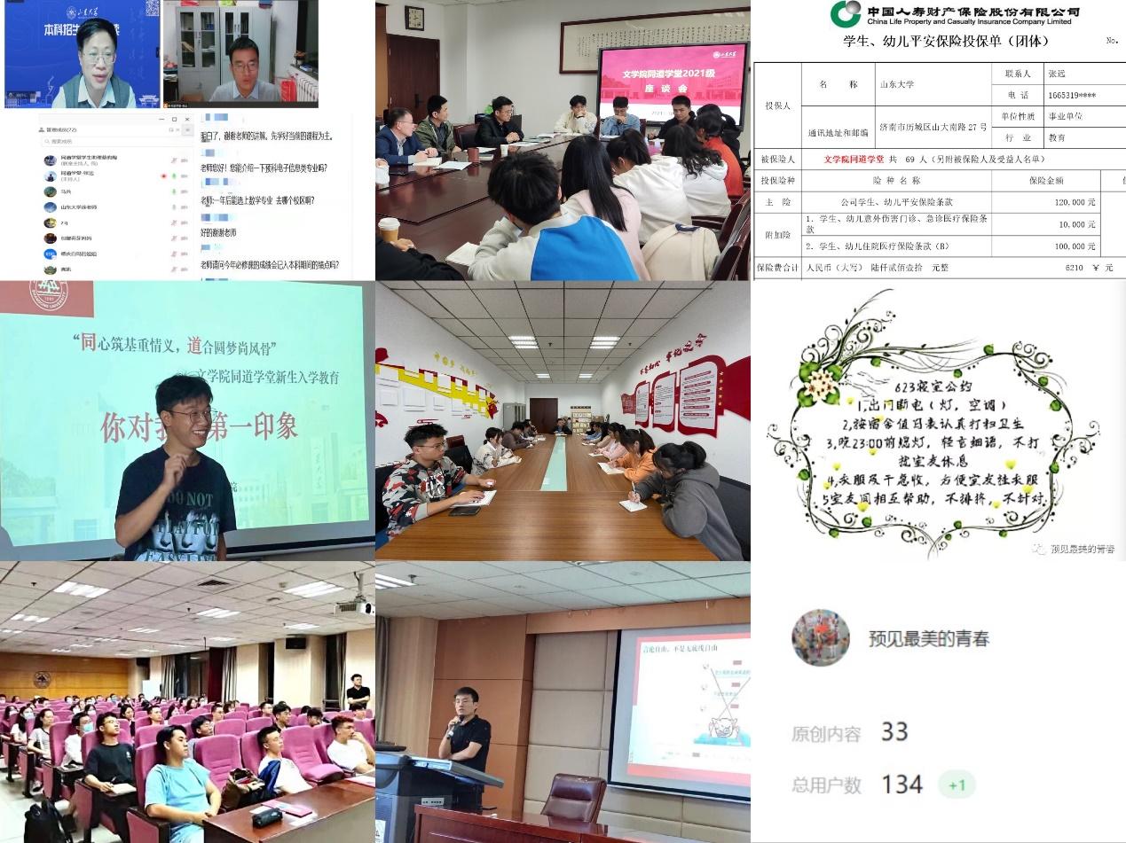 精益求精,细致入微。文学院同道学堂坚持以精细化服务管理为指导,厚爱严管。学院组织同道学堂线上家长会、师生座谈积极回应学生和家长疑惑;积极为学生申请购买校园保险;辅导员张远老师组织开展学生干部竞选答辩、班级服务团队研讨、制定宿舍公约、坚持每日晚点名、谈心谈话全覆盖等,为同道学堂学生成长保驾护航。带领同学们认真学习《山东大学学生住宿管理规定》和《山东大学学生纪律处分条例》,举办“共建网络文明,共享文明网络”主题讲座,强调要遵守校规校纪,文明上网。学生自主运营“预见最美的青春”班级微信公众号,及时展示班级活动,深化网络育人实效性。秉持“公平、公正、公开”的原则,进行“助、勤、免、贷”等各项工作,将政策落实落细。让同学们感受学校和学院的重视和关爱,厚爱严管,细致入微。