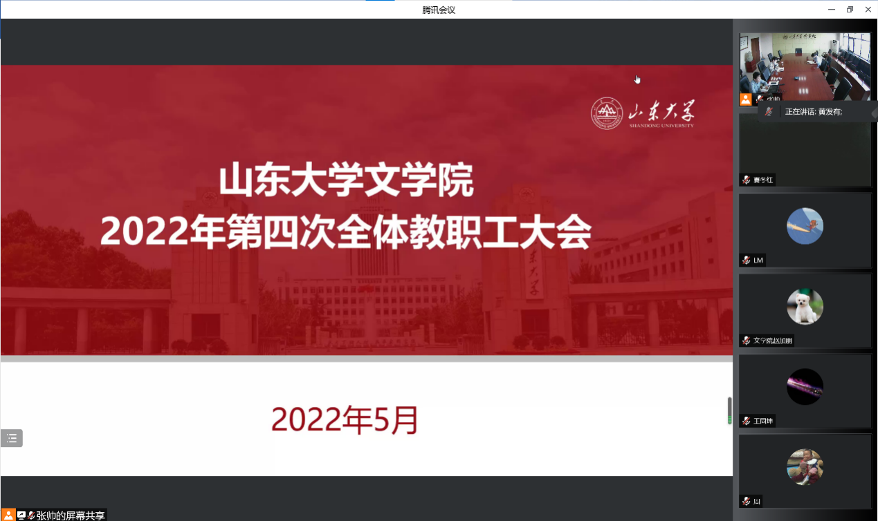 5月19日下午,248cc永利集团于知新楼A706召开2022年第四次全体教职工大会,校外老师通过线上会议参加。本次会议由院党委书记张帅主持。院长杜泽逊,常务副院长黄发有,副院长程相占、杨建刚,党委副书记王萌,副处级组织员沈文以及全体教职工参加会议。