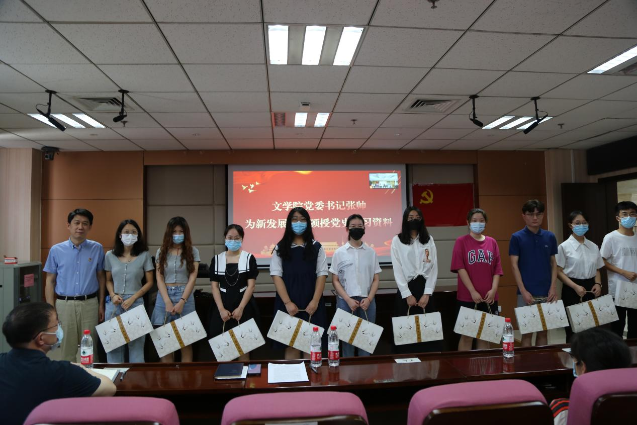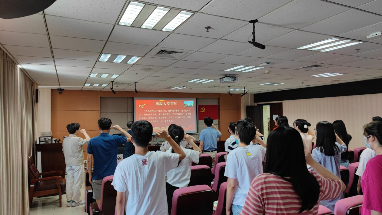 张帅为新发展党员颁授党史学习资料。王萌领誓,全体师生党员面对鲜红的党旗,举起右拳,庄严宣誓:“我志愿加入中国共产党,拥护党的纲领,遵守党的章程,履行党员义务,执行党的决定,严守党的纪律,保守党的秘密,对党忠诚,积极工作,为共产主义奋斗终身,随时准备为党和人民牺牲一切,永不叛党。”