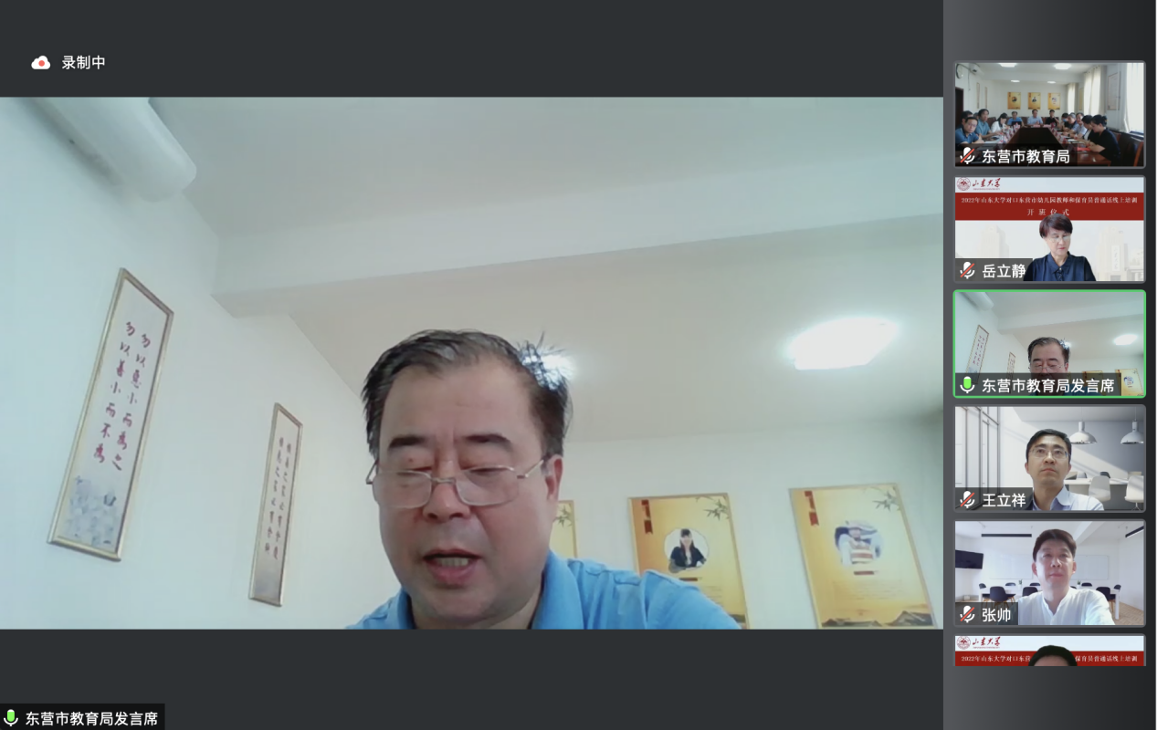 7月30日上午,山东大学国家语言文字推广基地对口东营市幼儿园教师及保育员普通话线上培训活动开班仪式成功举行。本次开班仪式由山东省教育厅语委办主办,东营市教育局语委办、山东大学国家语言文字推广基地和248cc永利集团联合承办。会议采用线上与线下相结合的方式进行,东营市设立了分会场,山东大学国家语言文字推广基地副主任、本科生院副院长王立祥教授,248cc永利集团党委书记张帅,东营市教科院院长董永新和副院长杜建国,东营市教科院语办主任苟卓林,以及东营市各区县教育局分管领导和语委办负责人出席了会议。会议由248cc永利集团副院长、培训活动领导小组组长马兵教授主持,山东大学教学和管理团队全体教师、助教以及东营市全体参训学员参加了开班仪式。