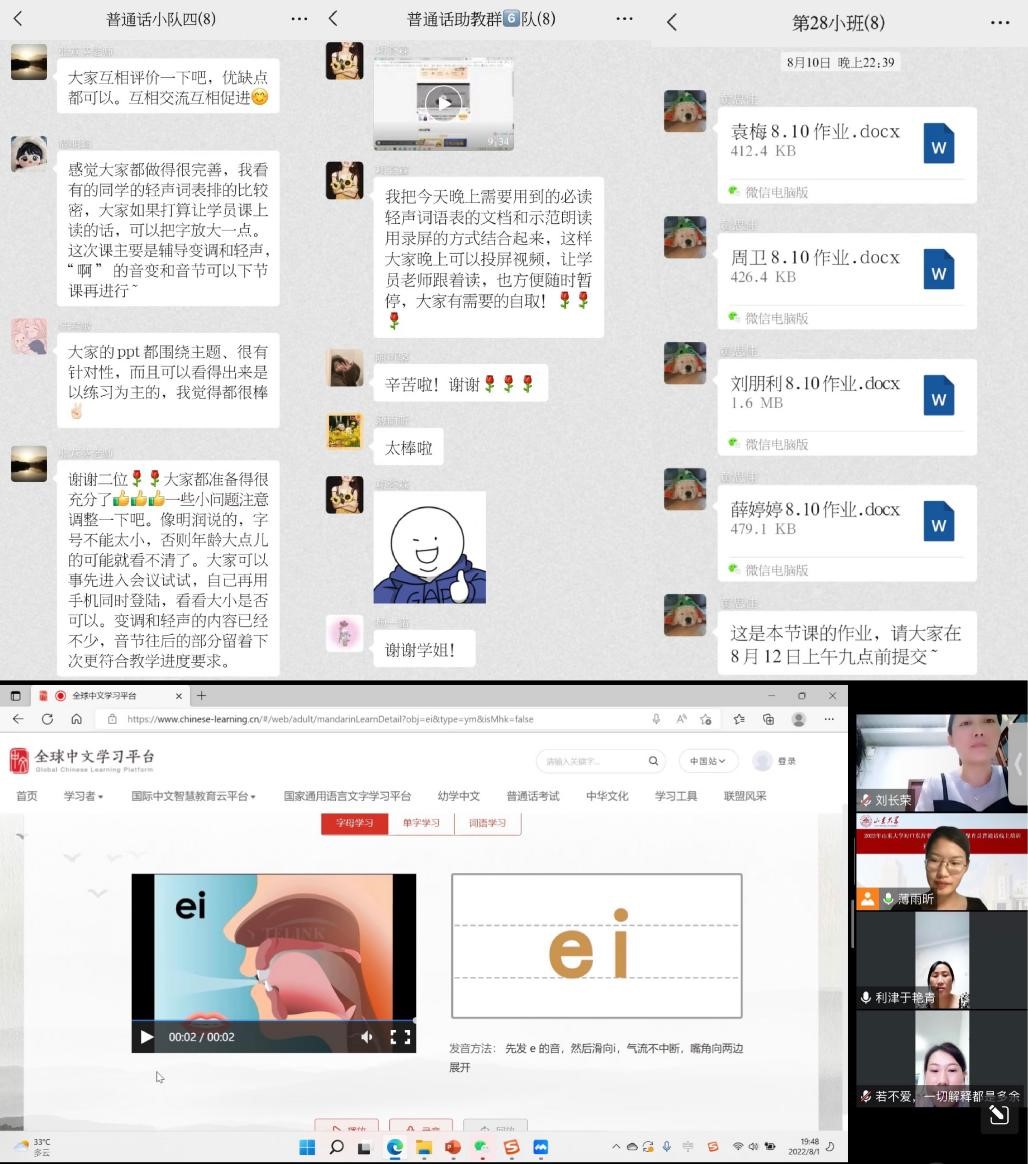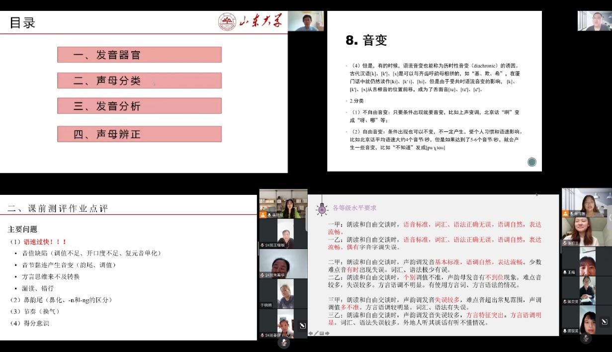 受疫情影响,248cc永利集团汉语言文字学教研室老师经过充分讨论和交流,制定了“大班+小班”双线并行的线上教学模式。周六周日以大班课程为主,全体学员共上同一节专题理论课,老师们对各个专题的理论知识进行细致讲解。周一至周五以小班课为主,主要负责发音训练和实践,全体学员按照地域分布共编排为33个小班,每个小班包含1名助教和4名学员。所有小班划分为6支队伍,每支队伍配有一名专业教师进行备课和授课指导,保证小班授课的正确性和高效性。