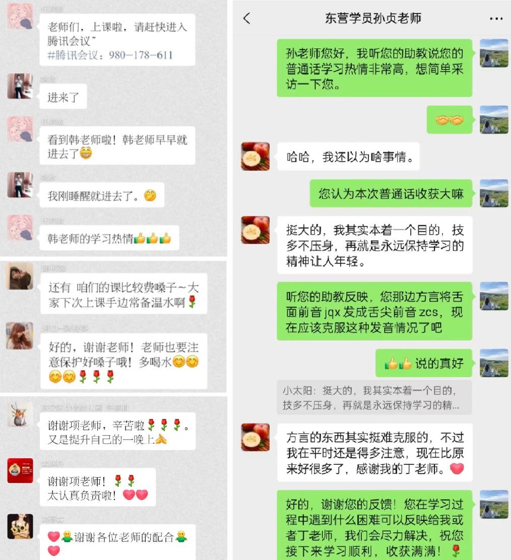 例如,丁丽萍助教在学前测试中发现广饶地区的部分学员将舌面前音j、q、x发成舌尖前音z、c、s,为此她精心备课,传授正确的发音要领,并一遍遍地领读相关字词,不断巩固学员的练习效果。学员孙贞表示:“方言问题虽然难以克服,但是在助教的帮助下我逐渐掌握了发音技巧,现在的发音已经改善许多,非常感谢助教老师的辛苦付出”。