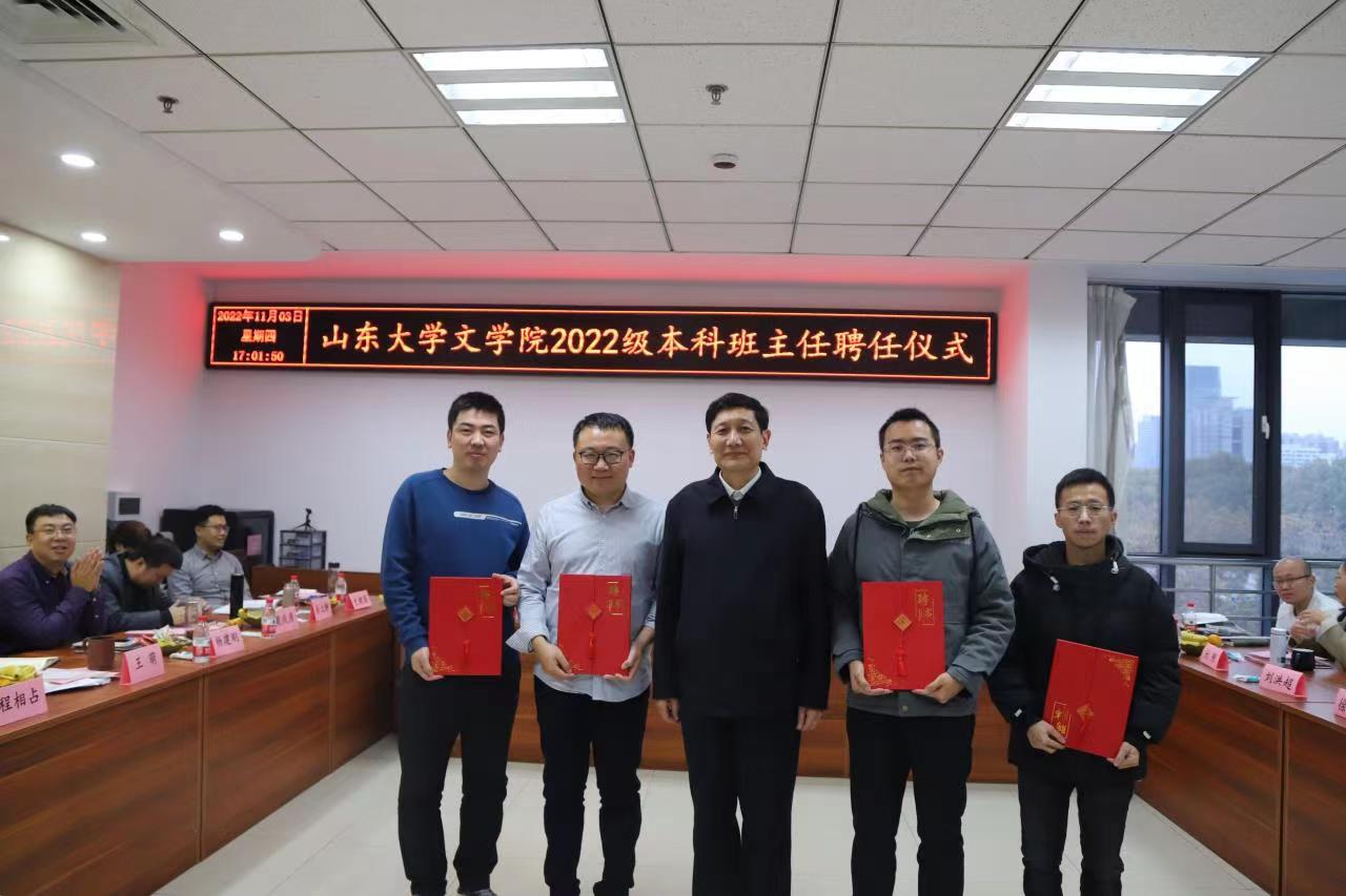 会上还举行了248cc永利集团2022级本科班主任聘任仪式。院长杜泽逊为强基班班主任侯瑞华、中基班班主任徐美德、中文1班班主任姚文昌、中文2班班主任刘书刚颁发聘书并合影留念。