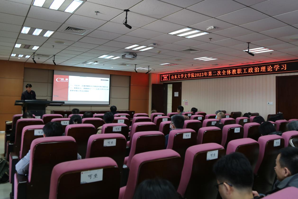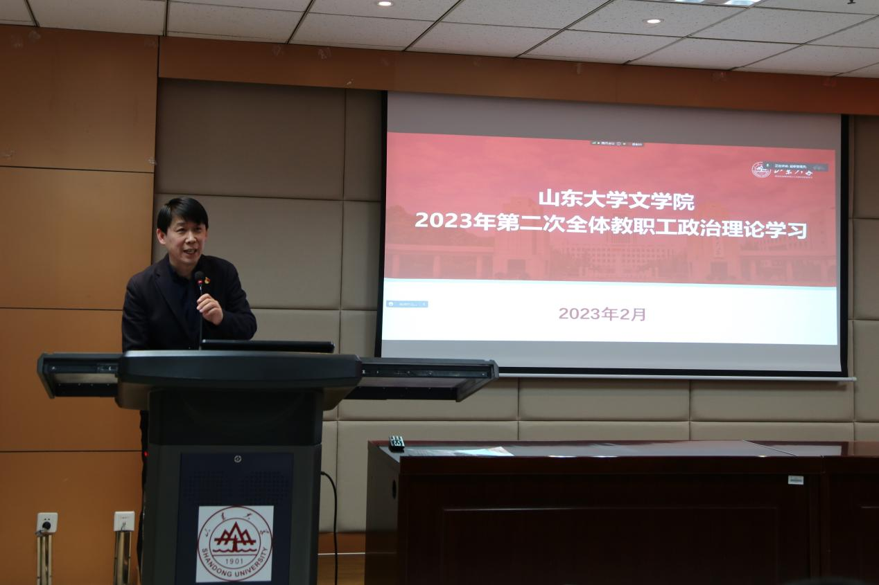 随后,张帅传达了山东大学2023年春季学期工作会议精神。张帅指出,校长李术才在会上对2022年的工作进行了系统总结,对2023年的七个方面27条重点任务进行了全面部署,围绕“全力以赴抓落实、强力推动高质量发展”提出三点要求:一是坚决捍卫“两个确立”,确保全力以赴抓落实、推动高质量发展的政治方向;二是始终心怀“国之大者”,坚定全力以赴抓落实、推动高质量发展的目标指向;三是坚定不移“团结奋斗”,树立全力以赴抓落实、推动高质量发展的价值导向。校党委书记郭新立表示,要切实把思想和行动统一到党的二十大精神上来,把力量凝聚到党的二十大确定的各项任务上来,加快开创世界一流大学建设新局面,郭新立就下一步学校发展提出了三点要求:一是深学细悟、知行合一,持续推动思想认识的提档升级;二是守正创新、勇毅前行,持续推动战略行动的提档升级;三是攻坚克难、行稳致远,持续推动策略方法的提档升级。张帅要求,新学期新气象,全院师生要按照学校党委的部署要求,深入学习和深刻领会郭新立书记和李术才校长的讲话精神,落实立德树人根本任务,赓续“重情义、尚风骨、尊学术”的优良传统,提升科研教学能力与科研服务水平,在新的历史起点推进山大“双一流”中文学科建设。
