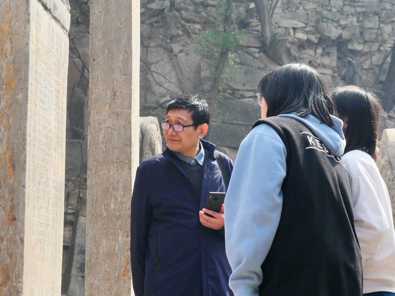灵岩寺位于济南市西南泰山北麓长清县万德镇灵岩峪方山之阳,始建于东晋,距今已有1600多年的历史。现存各种碑刻题记散存于山上殿宇院壁和窟龛之中。甫一进入灵岩寺,游学师生即根据课程实践安排和兴趣焦点,或以千佛殿、御书阁、辟支塔、墓塔林等标志性文化景观为中心,研读灵岩寺建筑群所存碑刻,深入了解灵岩寺的历史文化谱系和重要文物资源意义;或以攀登灵岩山为主线,沿途观赏钟毓灵秀的自然风光、绝壁巉岩之上的摩崖石刻,体味自然造物的鬼斧神工,赞叹文化遗迹的蔚为大观。杜泽逊老师悉心为同学们介绍碑刻文化常识,帮助同学解读部分碑刻和漫漶不清、难以辨认的碑别字,同学们自由选择、认领碑刻,将碑刻内容转写并句读,师生之间相互讨论分享,氛围热烈而融洽。