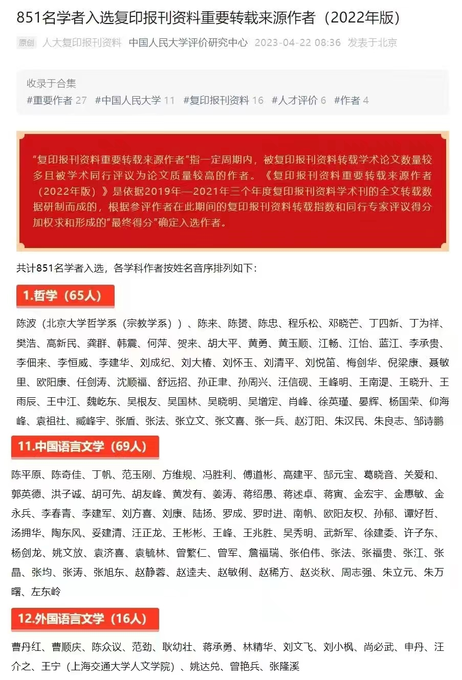 据悉,“复印报刊资料重要转载来源作者”指一定周期内,被复印报刊资料转载学术论文数量较多且被学术同行评议为论文质量较高的作者。《复印报刊资料重要转载来源作者(2022年版)》是依据2019年—2021年三个年度复印报刊资料学术刊的全文转载数据研制而成的,根据参评作者在此期间的复印报刊资料转载指数和同行专家评议得分加权求和形成的“最终得分”确定入选作者。本次各学科共计有851名学者入选,其中,中国语言文学学科共入选69人。