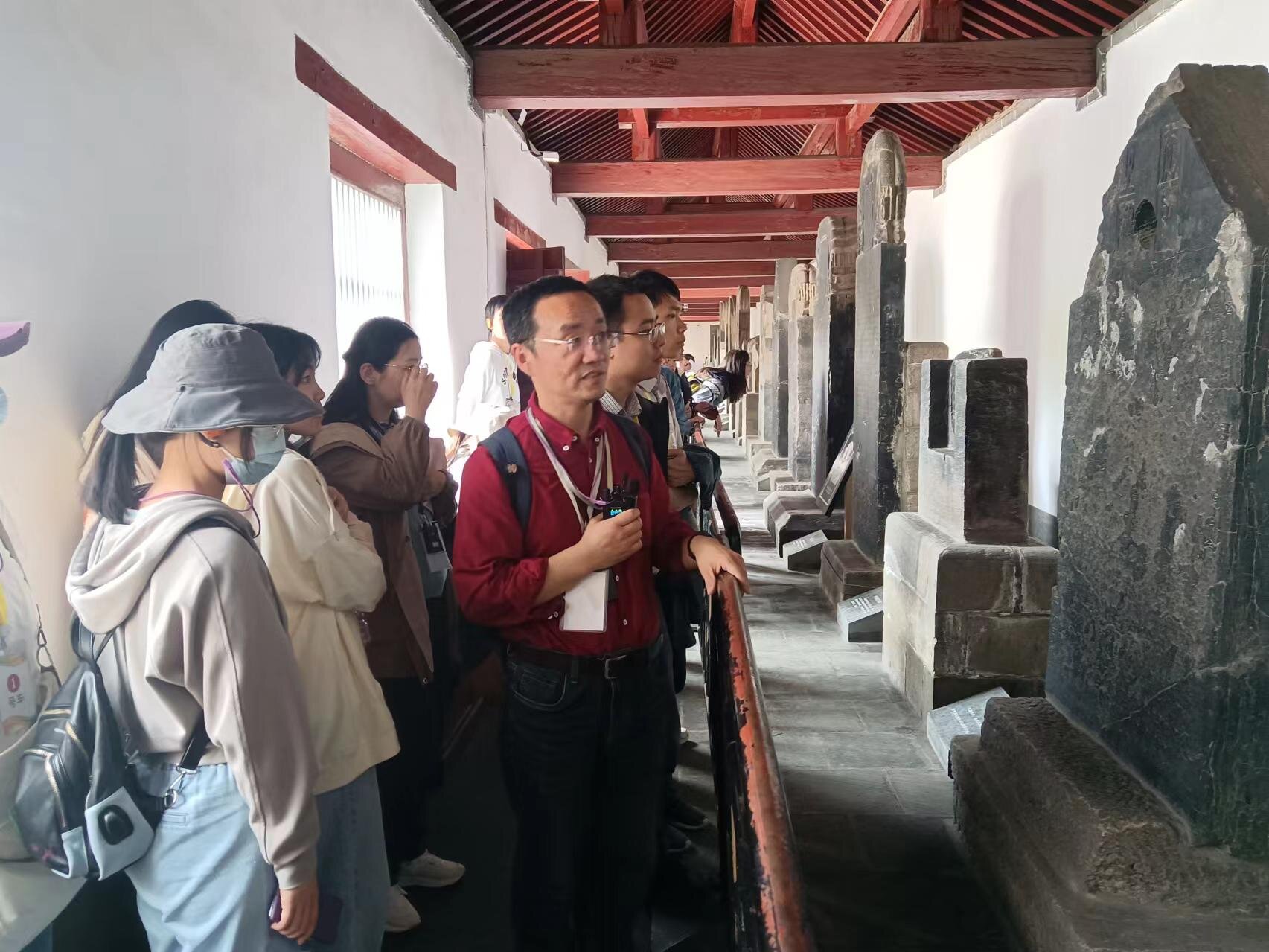 20日下午,研学团队抵达泰安岱庙。岱庙俗称“东岳庙”,是中国古代帝王供奉泰山神灵,举行祭祀大典的场所,堪称泰山历史文化的缩影。岱庙保存了自秦汉以来的历代碑碣石刻与古树名木,数量之多、品类之盛非别处庙宇可以媲美,因此历史底蕴与文化积淀极其深厚。研学团队在“秦泰山刻石”碑前驻足观赏,文字学专业的老师为同学们悉心讲述刻石文的悠久历史,在场学子对这流传千年而不朽的文化胜景莫不交口称赞。