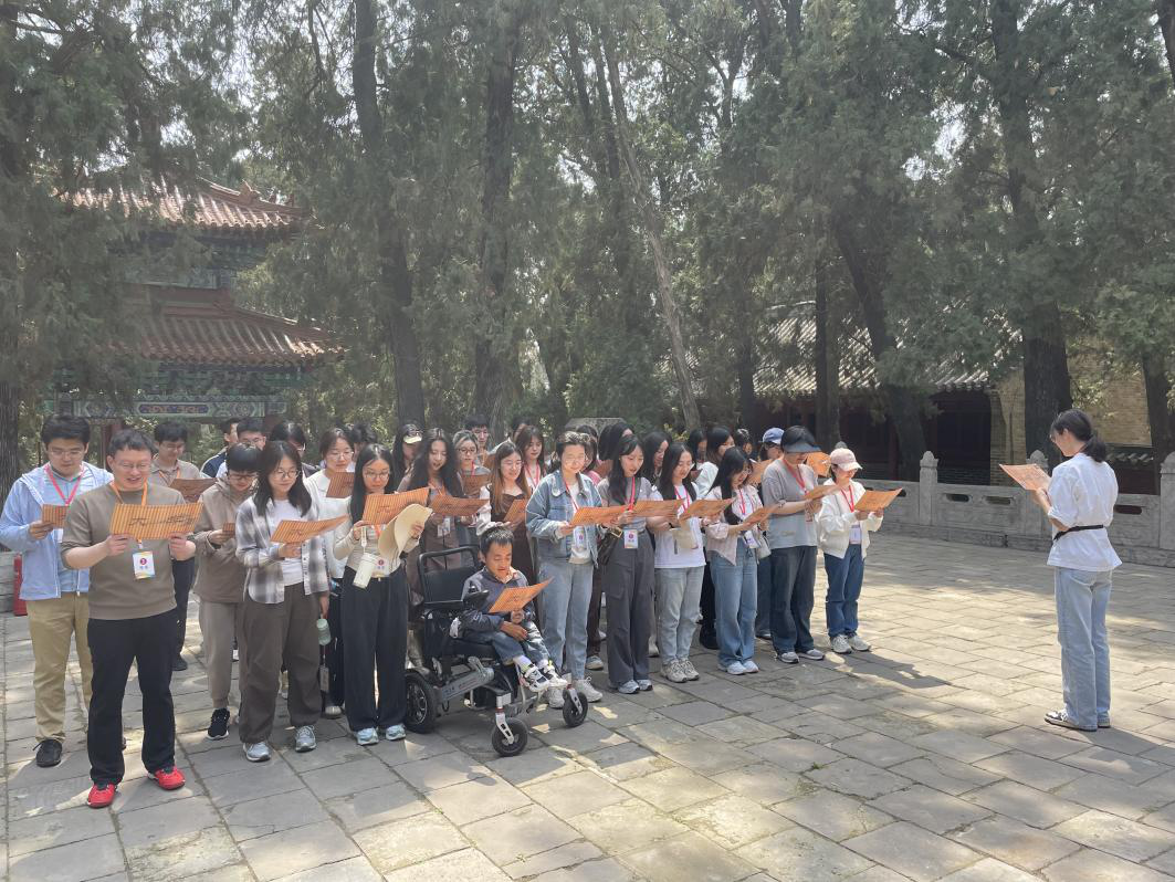 20日下午,游学团顺利抵达嘉祥曾庙进行参观。曾庙是祭祀曾参的专庙,建筑风格古朴典雅,气势恢宏。跟随着导游的讲解,同学们先后参观了石牌坊、涌泉井、明万历碑亭与乾隆御碑亭等景点,进一步了解了曾子的生平事迹和思想成就,并在曾庙前齐声诵读《大学》,深刻感悟先贤的崇高品德和卓越智慧。