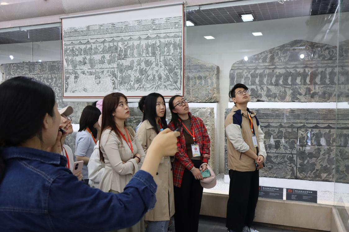 随后,游学团前往武氏祠,参观欣赏精美的石刻艺术。武氏祠汉画像石集汉画像石刻艺术之大成,是我国最大、保存最完整的汉画像石群。石刻艺术造型灵动飘逸,布局疏密有序,线条精妙细致,人物形象顾盼生姿。参观过程中,同学们对武氏祠石刻的精湛技艺和丰富内涵赞叹不已。通过仔细观赏石刻上的图案和文字,同学们得以穿越岁月的风尘,感受古代人民的丰富的想象力与创造力,领略中华优秀传统文化的源远流长、博大精深。