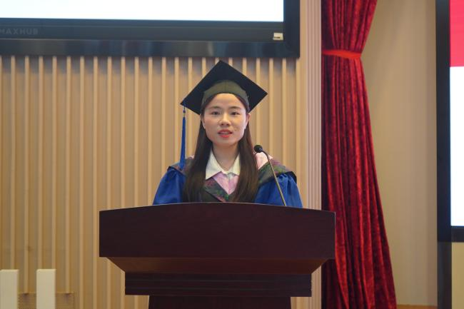 2024届硕士毕业生杨赛作为毕业生代表上台发言。她深情回忆了在文学院求学的点滴经历,逐一感谢了家人师友的温暖关怀与热心帮助。她表示,正是这些陪伴与支持激励着她不断磨砺意志、积蓄力量,最终收获不从于人云亦云的独立思想和无惧于艰难险阻的前行勇气。最后,她祝愿同学们永葆在文学中涵养出的鲜活生命感受与深沉时代关照,无畏过往遗憾、不惧未来挑战,坚守热爱笃行前路,心怀期许奔向远方。