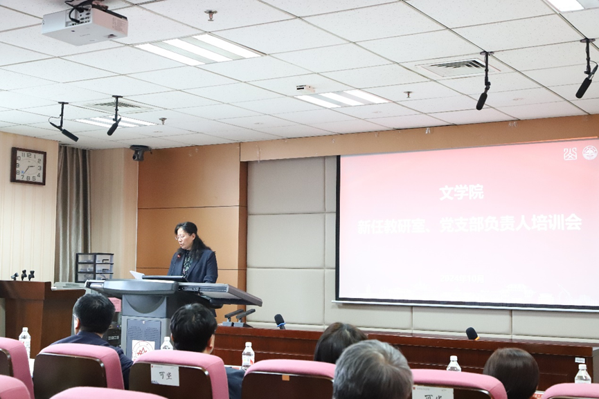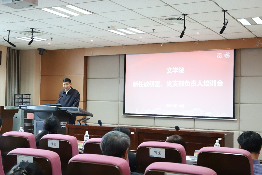 山东大学党委副书记李向阳同志对本次换届及培训工作表示肯定。他表示,山大文学院文化底蕴厚重,文学院党委注重文脉赓续,也同样重视打造新时代文化高地。他强调,新任教研所、党支部负责人要与全体文院教职工一起继往开来,厚植家国情怀,担负起新的文化使命。同时,对加强基层党组织建设提出了几点要求:一是要强基固本,把教工支部因地制宜建设好,与时俱进发展好,确保立德树人根本任务落实落地。二是要聚势谋远,不断增强政治领导力、思想引领力、社会号召力、群众组织力,全面提升教工党建质量。三是敢闯敢干,志存高远,心怀“国之大者”,锚定文化强国战略目标,落实立德树人责任和使命,争做优秀带头人,为建设文化强国建设贡献山大智慧与力量。