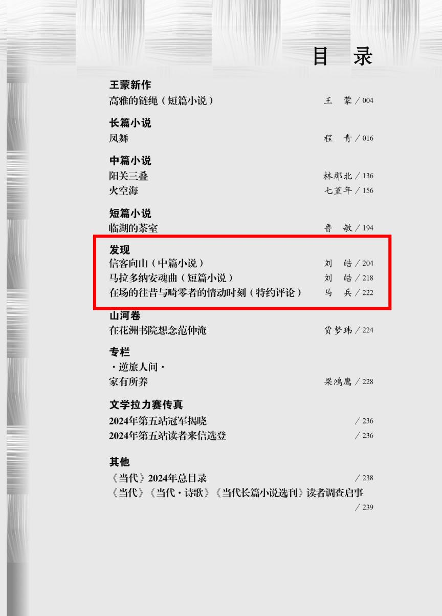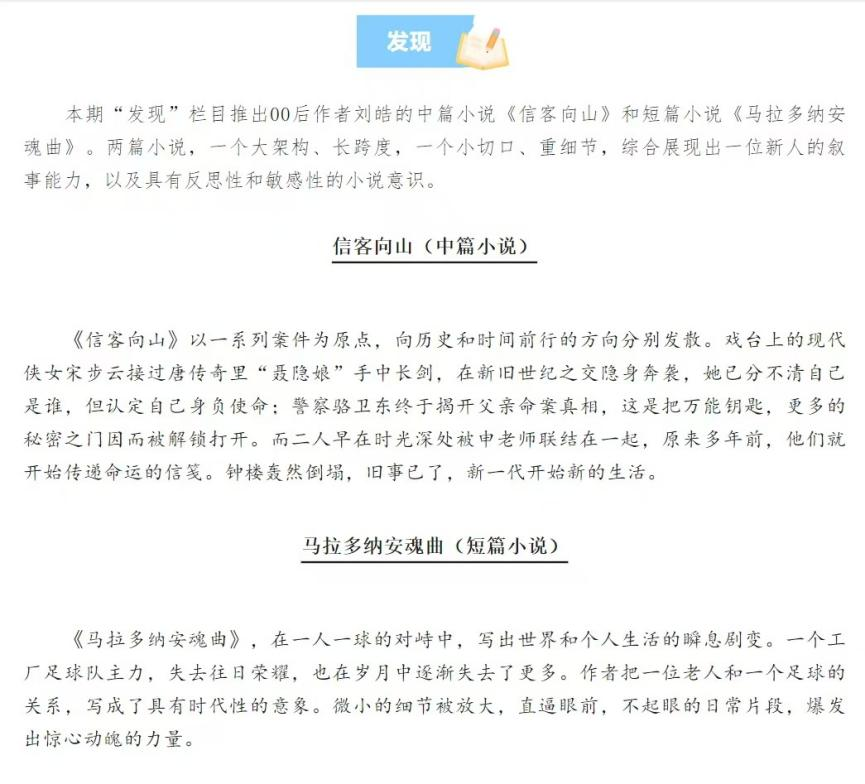 近日,《当代》2024年第6期“发现”栏目发表248cc永利集团2021级闻一多班刘皓的中篇小说《信客向山》和短篇小说《马拉多纳安魂曲》。