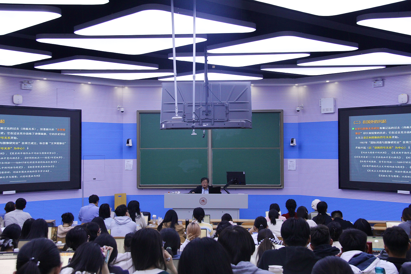 首场讲座于11月11日19点举行,主题为“文学与图像绪论”,由文艺美学研究中心杨建刚教授主持。赵宪章教授首先以徐冰的《天书》与《地书》为例讲述了文学与图像研究兴起的背景是“图像时代”的负面影响及其符号危机,又从国外、国内两个方面介绍了文学与图像研究的概况,认为语言学与图像学矛盾并存。这也决定了“文学图像论”的立场与意义是通过文图关系研究,回应人类所面临的“符号危机”,体现人文学术的人文关怀。而后,赵宪章教授介绍了文学图像论的命名与方法。“文学图像论”由维特根斯坦《逻辑哲学论》中的语言图像论取义,因此,“文学图像论”就是要探讨文学与世界的图像性关系,以及语言艺术与图像艺术之间的关系。“文学图像论”核心就是阐发作为语言艺术的文学与视觉图像之间的逻辑关系,而非传统的“形象思维”论。进而,赵宪章教授提出“文学图像论”的方法是语象与图像的对读和比较,并以中国题画诗的三个历史发展阶段为例,说明中西关注的诗画关系理论问题不同,“表现”与“再现”的语图关系不同。总之,“文学图像论”应将发现“语图关系”作为根本目标;其中,发现语图“非再现”“非对称”更有价值。赵宪章教授认为文学作为语言的艺术是一种“象思维”语言,更是经由图像和世界发生逻辑联系,因此,文学图像论就是要探讨文学与世界的图像性关系,以及语言艺术与图像艺术之间的关系,方法是对语象与图像灵活地对读和比较。最后,赵宪章教授以鲁迅小说中的色彩为例讲述了“文学图像论”的语图对读,鲁迅的小说具有版画的风格,其小说语象和版画图像统觉共享。总之,“文学与图像”学术思潮在晚近兴起不是偶然的,既有现实感怀,又有学术史积累及其必然性。“文学与图像”作为中国新世纪的新学问,尽管只有短暂的历史,却有悠久的过去、真实的现在与可感的未来。