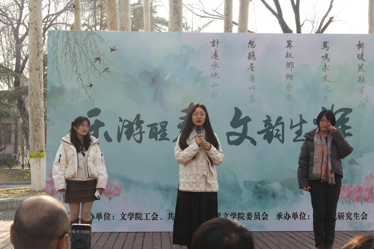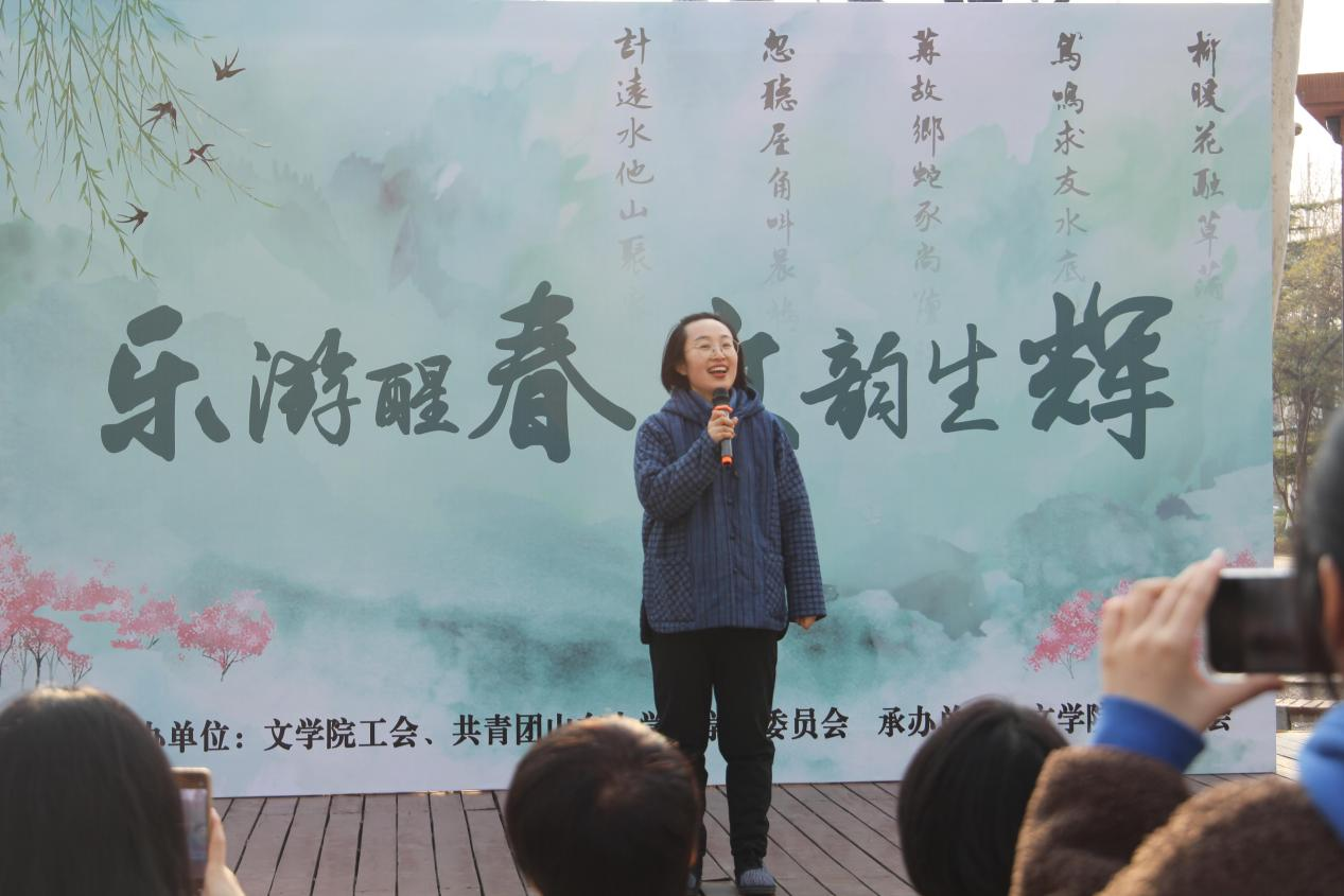 下午三时,备受期待的“闹春诗韵”诗词吟诵打卡环节在热烈的氛围中开始,各类精彩节目轮番登台,亮点纷呈。院研究生会实践部成员演唱一首《遇见你的时候所有星星都落在我头上》,拉开活动序幕。紧接着,各个节目在暖阳斜照中渐入佳境:教师郭春晓、沈文、杨海燕、栾妮、刘占召、朱家英、果娜、吉顒带来《古诗组诗》《春江花月夜》朗诵;教师张燕芬别出心裁,分别用粤语和普通话吟诵《一剪梅》《如梦令》;教师孙雅乔、宋海涛、孙铭孺带来诗歌朗诵《我们是青年》;教师万佳俊、王涵、寇鑫分别以歌唱、英语和普通话的朗诵方式演绎了春日《第一篇章》;教师吉顒、郑婷婷、田玉洁、侯静、房言言、张洁、侯星星配合默契,带来《第二篇章》;《第三篇章》则由学生诗词爱好者演绎,朗诵声久久回响。接着,教师张洁以美声唱法演绎了《军营里飞来一只百灵鸟》;山东大学学生演讲协会成员创造性融合现代舞和情景朗诵,呈现一曲《浴风春舞》;山东大学学生相声协会成员以快板《哪吒闹海》点燃全场;研究生王少宇、牛洪照带来的戏曲节目《沙家浜·智斗》重现经典。师生们或唱或演,将传统文化与现代艺术完美交织,赢得现场阵阵掌声与喝彩,将活动的氛围推向高潮。