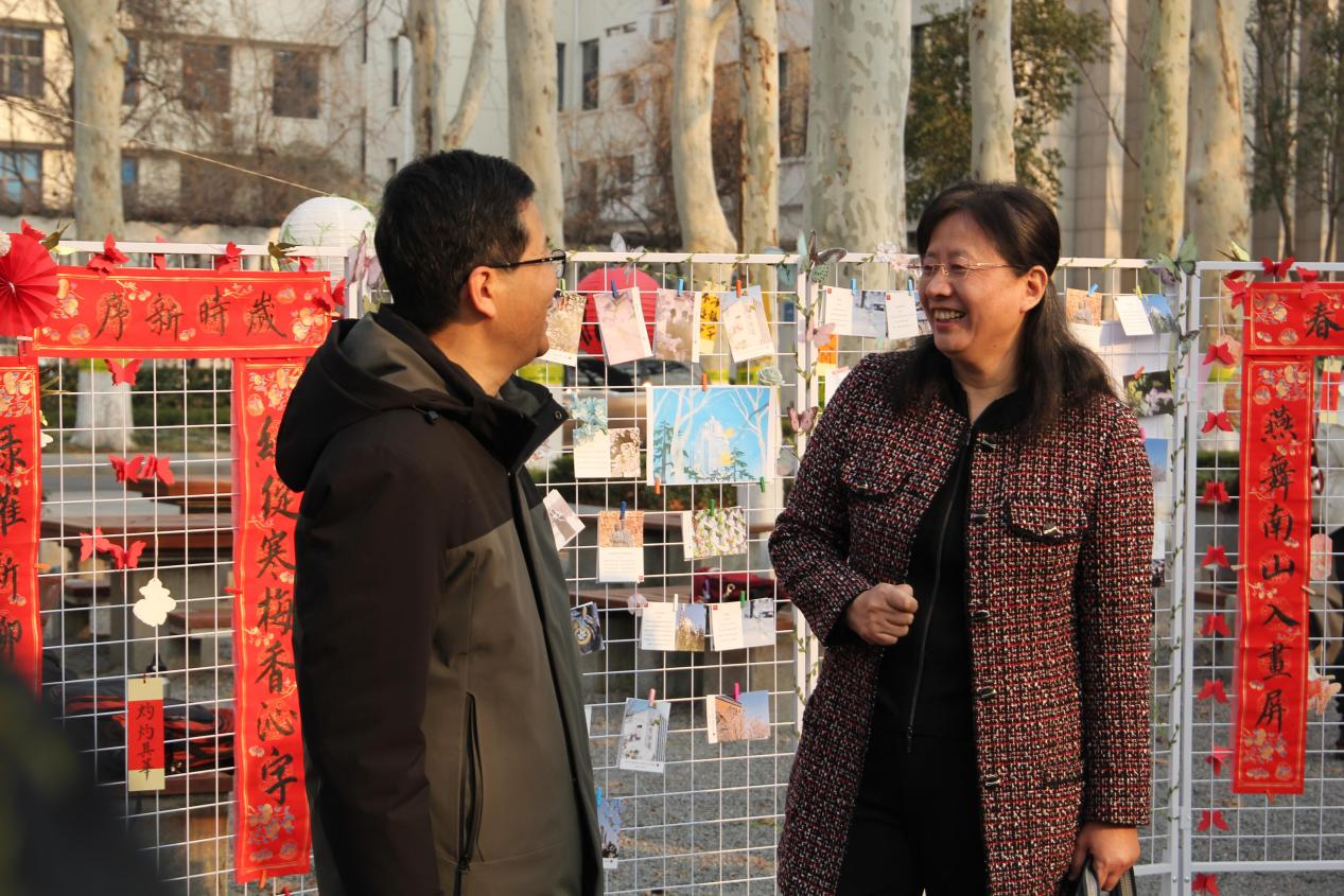 在“楹联溢趣”趣味对联展台,师生们围绕“红绽寒梅香沁字”“莺歌北渚催诗笔”两副上联展开即兴创作,“绿催新柳色沾巾”“燕舞南天引月笛”等诸多下联纷纷涌现。中国古代文学专业教师乐进进还从平仄、对仗、意蕴等角度进行了现场点评,与师生一起品味联对文化的独特风华。