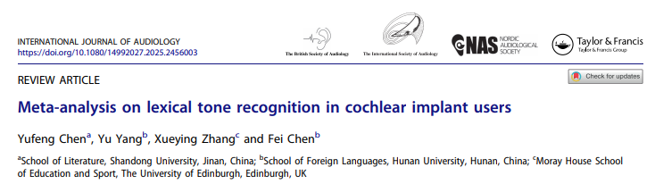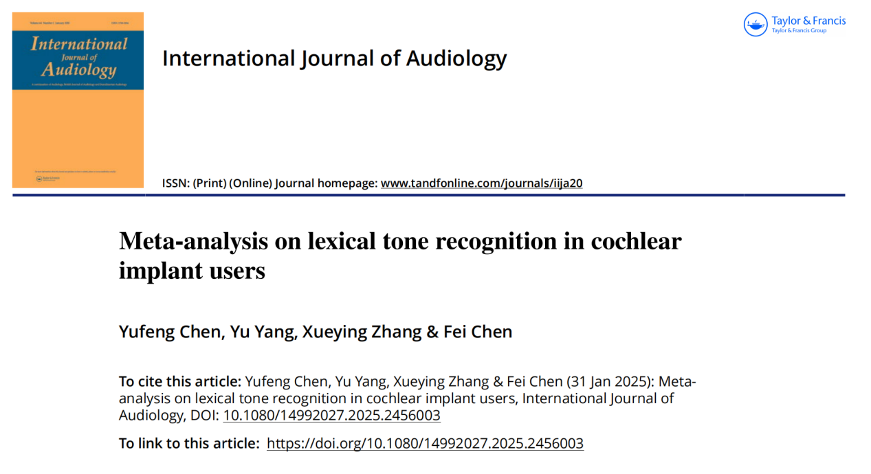 近日,248cc永利集团2022级博士研究生陈禹风(导师岳立静教授)在国际知名听力学期刊《国际听力学杂志》(International Journal of Audiology)上发表了题为“Meta-analysis on lexical tone recognition in cochlear implant users”的研究成果。本研究系一项跨学校、跨学科合作研究成果。陈禹风为该文第一作者,山东大学为第一作者单位。湖南大学外国语学院的陈飞教授为该文通讯作者,其研究团队长期致力于“言语链”中语音编码、神经传输、听觉解码等关键环节的机制研究。