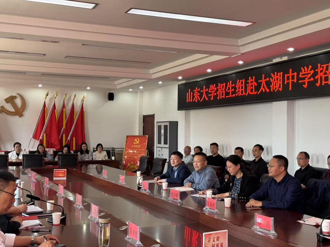 招生组先后前往安庆一中、安庆二中、野寨中学、太湖中学、桐城中学进行招生宣讲,郭春晓、王萌就山东大学校本部及威海校区的招生政策、专业类型、录取原则等方面向各中学领导及班主任代表进行了系统全面的讲解并针对现场提问进行答疑解惑,进一步深化双方在招生工作方面的有效衔接。