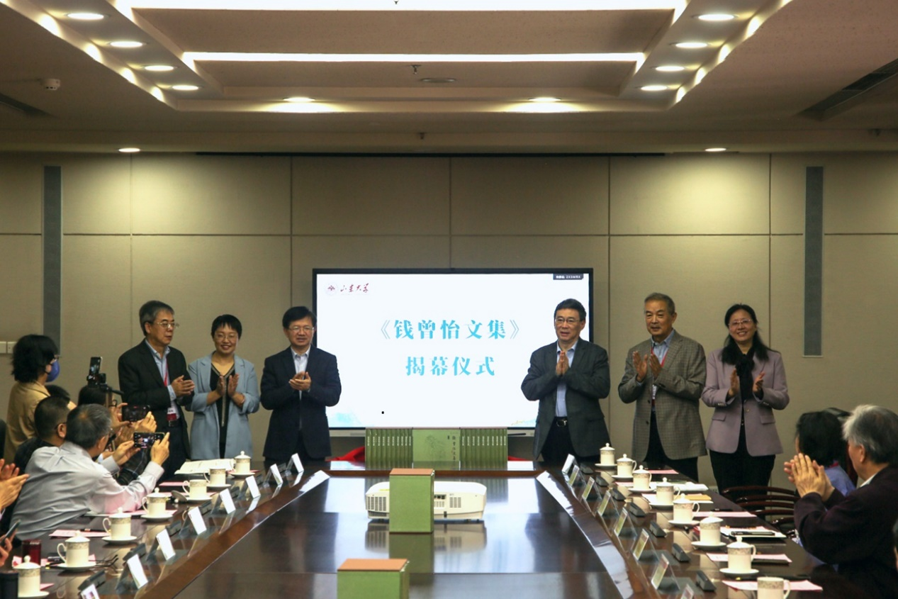 在庄重的红色帷幕揭开的瞬间,大家一同见证钱曾怡先生的智慧结晶——装帧典雅的《钱曾怡文集》正式面世,并以热烈的掌声表示祝贺。