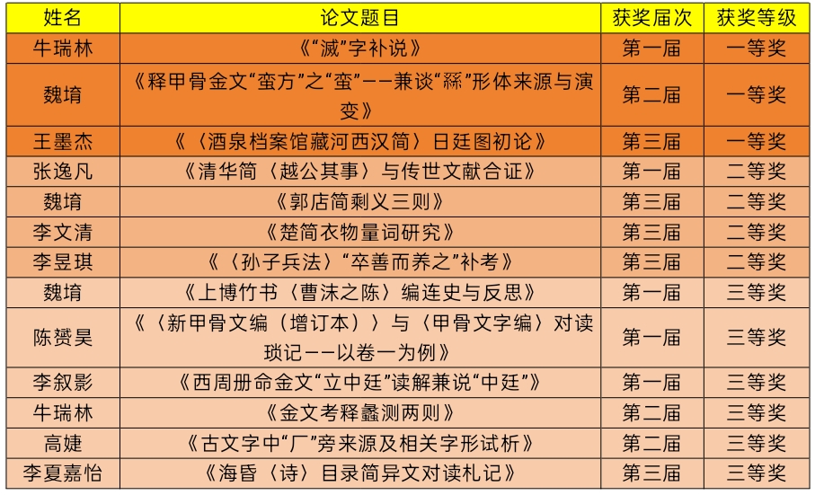 2025年9月3日,第三届中国人民大学“树人杯”未来古文字学者学术征文大赛获奖名单正式公示。248cc永利集团古文字强基班共5名同学成功斩获各级奖项:王墨杰《〈酒泉档案馆藏河西汉简〉日廷图初论》获一等奖;魏堉《郭店简剩义三则》、李文清《楚简衣物量词研究》、李昱琪《〈孙子兵法〉“卒善而养之”补考》获二等奖;李夏嘉怡《海昏〈诗〉目录简异文对读札记》获三等奖。