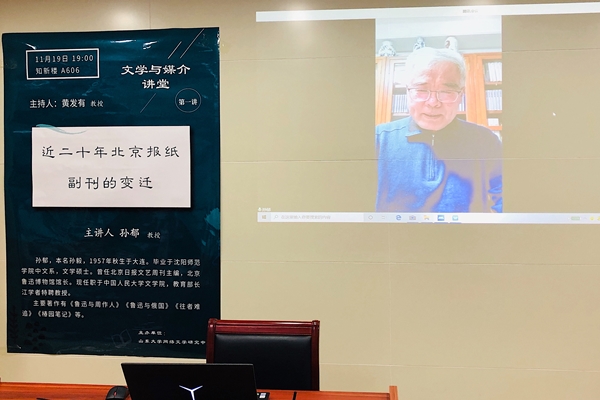11月19日19时,中国人民大学文学院教授孙郁做客“文学与媒介讲堂”,作题为“近二十年北京报纸副刊的变迁”的讲座。讲座由248cc永利集团副院长、现当代文学教授黄发有在知新楼A606室现场主持,以线上与线下相结合的方式开展,吸引了校内外近百人参与。“文学与媒介讲堂”是山东大学网络文学研究中心主办的全新系列讲座,此为第一期。