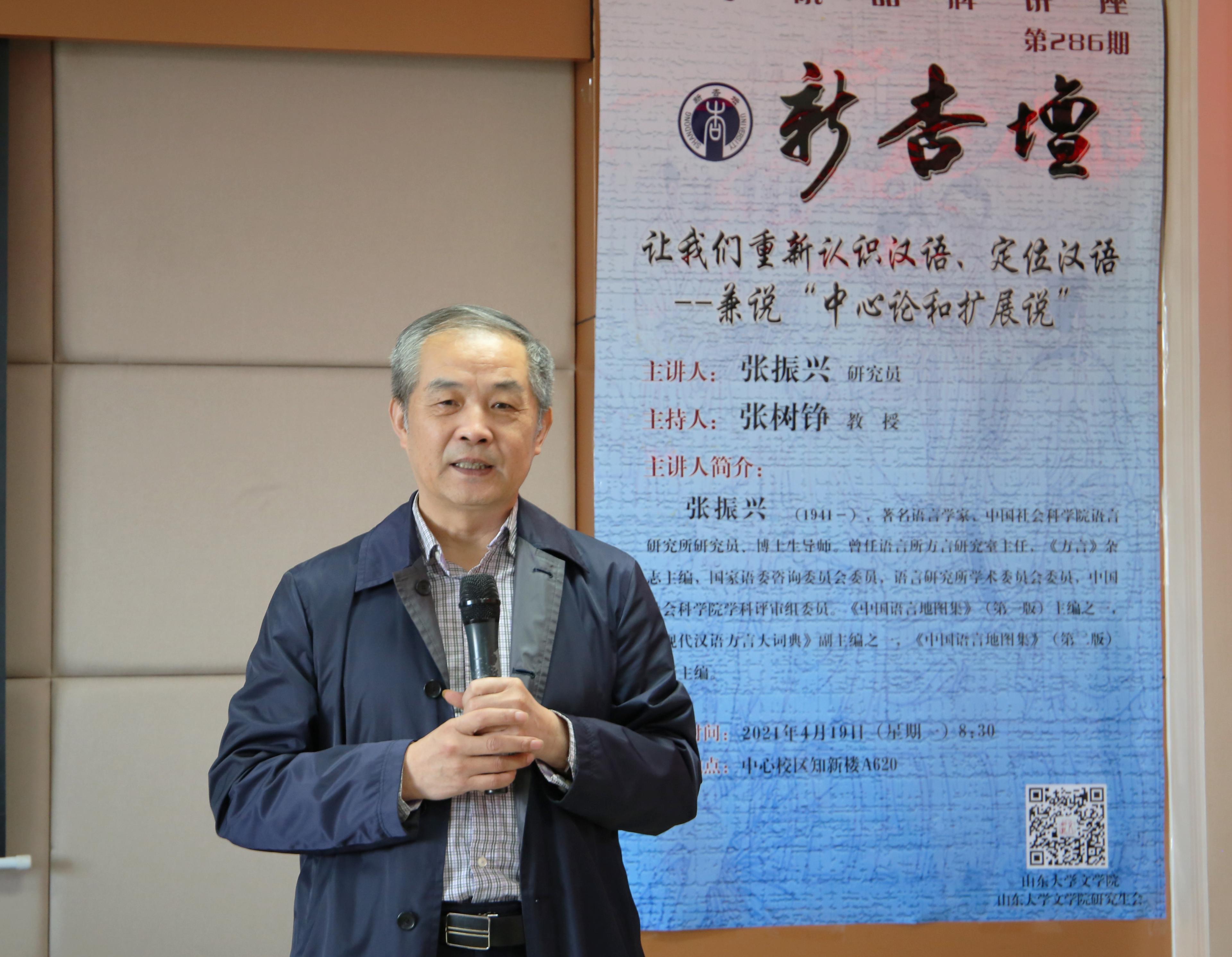 4月19日8:30,著名语言学家、中国社会科学院语言研究所研究员、《方言》杂志原主编张振兴先生做客“新杏坛”,在知新楼A620作题为“让我们重新认识汉语、定位汉语——兼说‘中心论和扩展说’”的讲座。讲座由张树铮教授主持,张惠英教授、张燕芬副教授参与,文学院众多师生共同聆听了本场讲座。