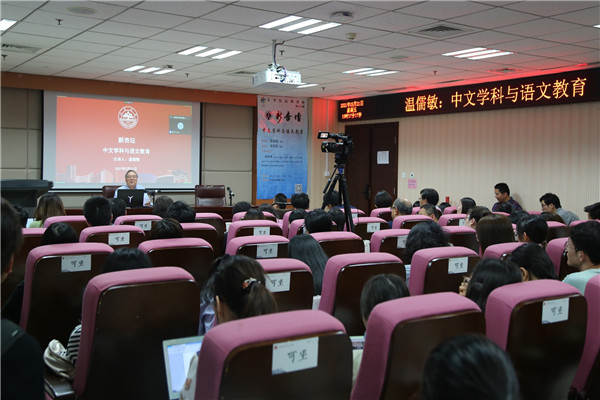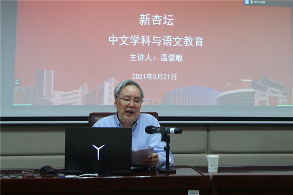 5月21日晚,山东大学特聘人文社科一级教授、北京大学语文教育所所长温儒敏先生做客新杏坛,在知新楼A620作题为“中文学科与语文教育”的讲座。讲座由文学院副院长黄发有教授主持,文学院院长杜泽逊教授、院工会主席沈文出席讲座,丛新强、国家玮、邵部、侯滢等多位老师到场聆听。讲座同时开设多个分会场,并提供线上观看链接,吸引了校内外数百位师生参与。