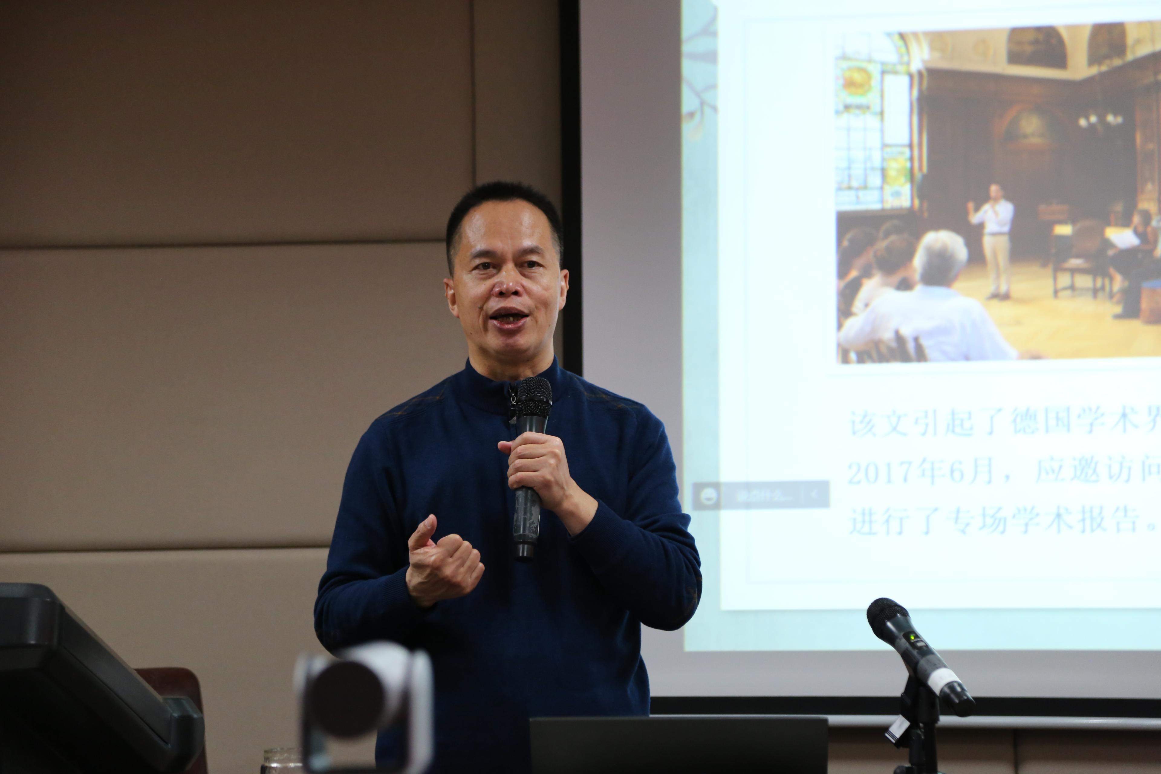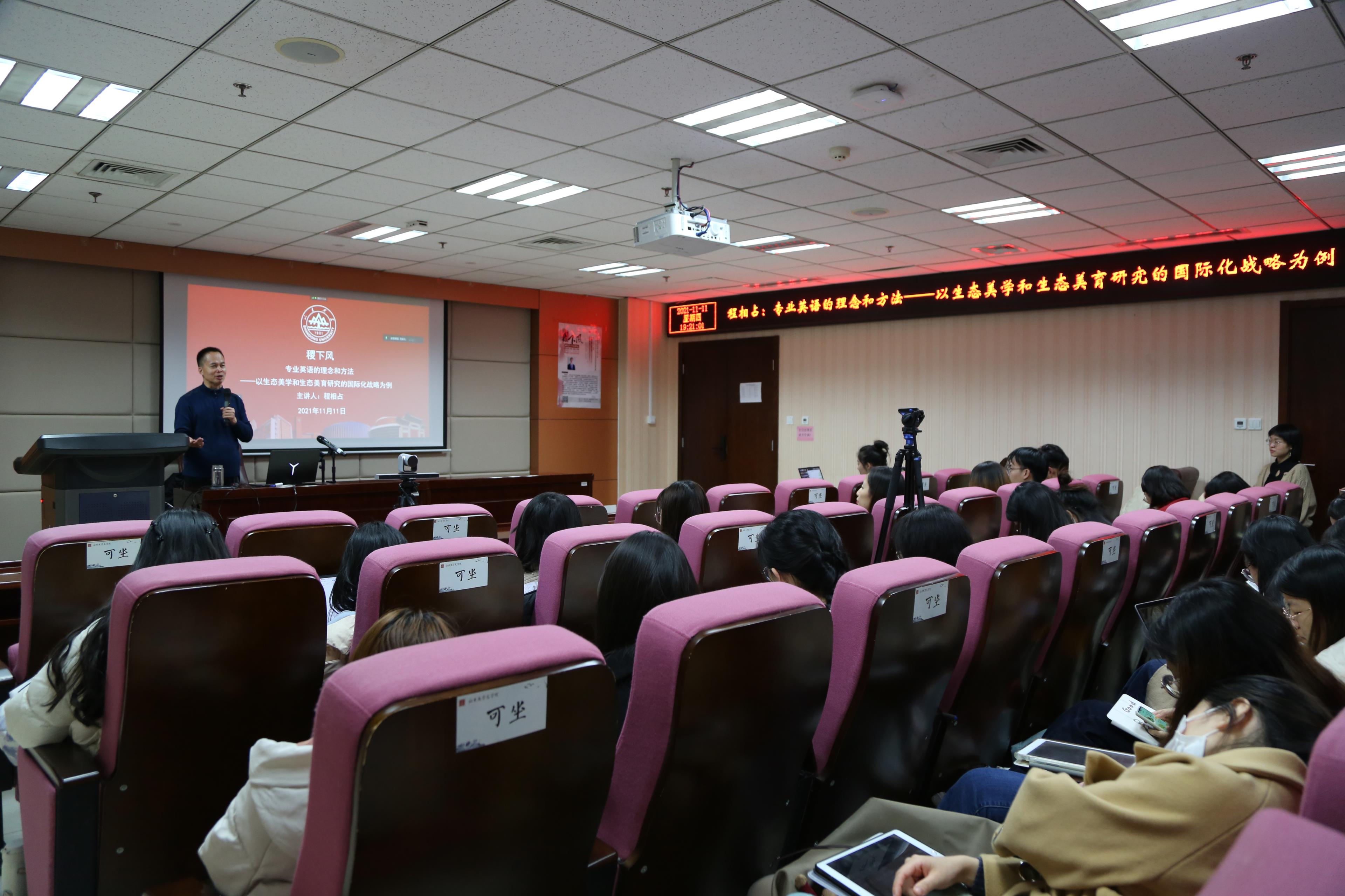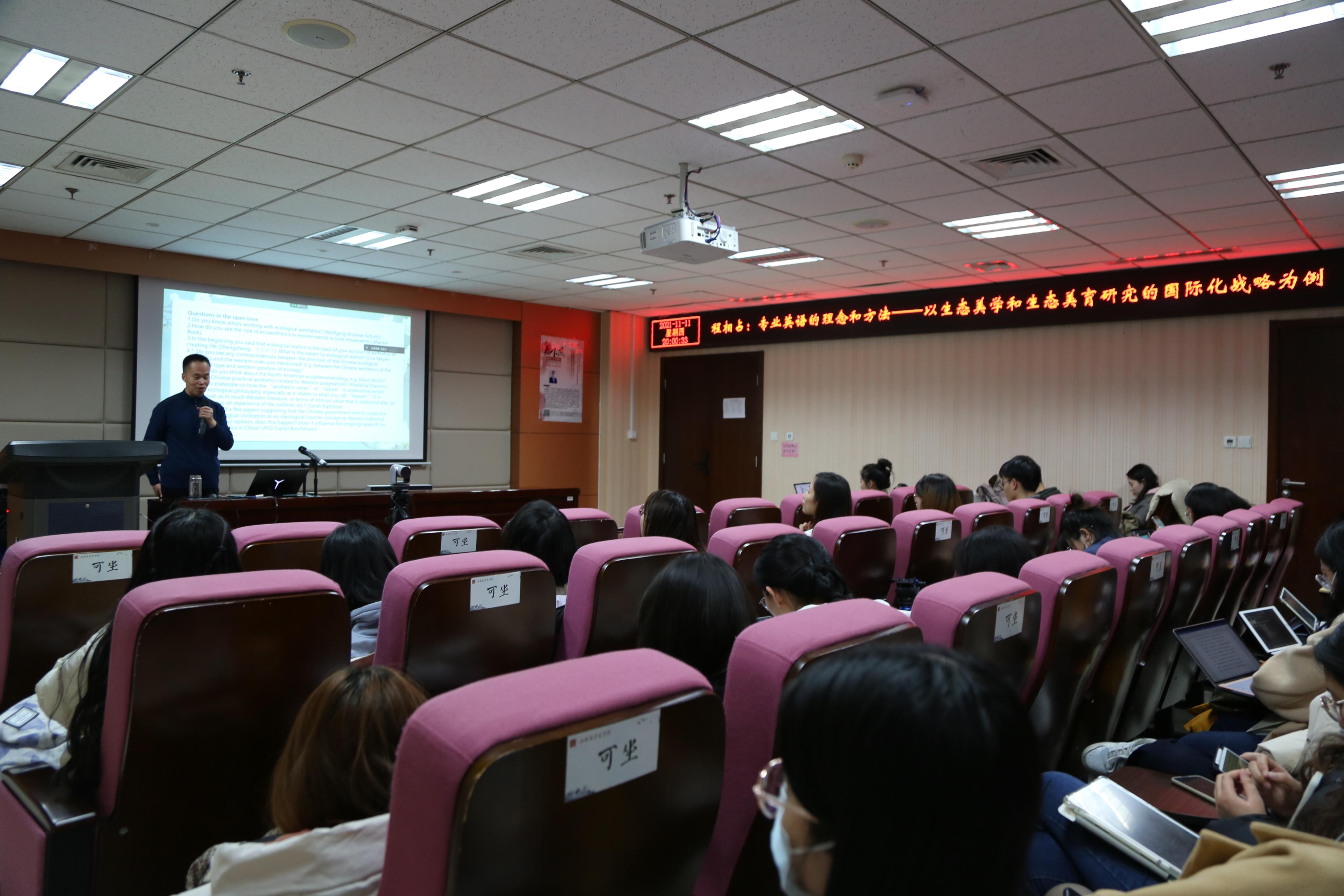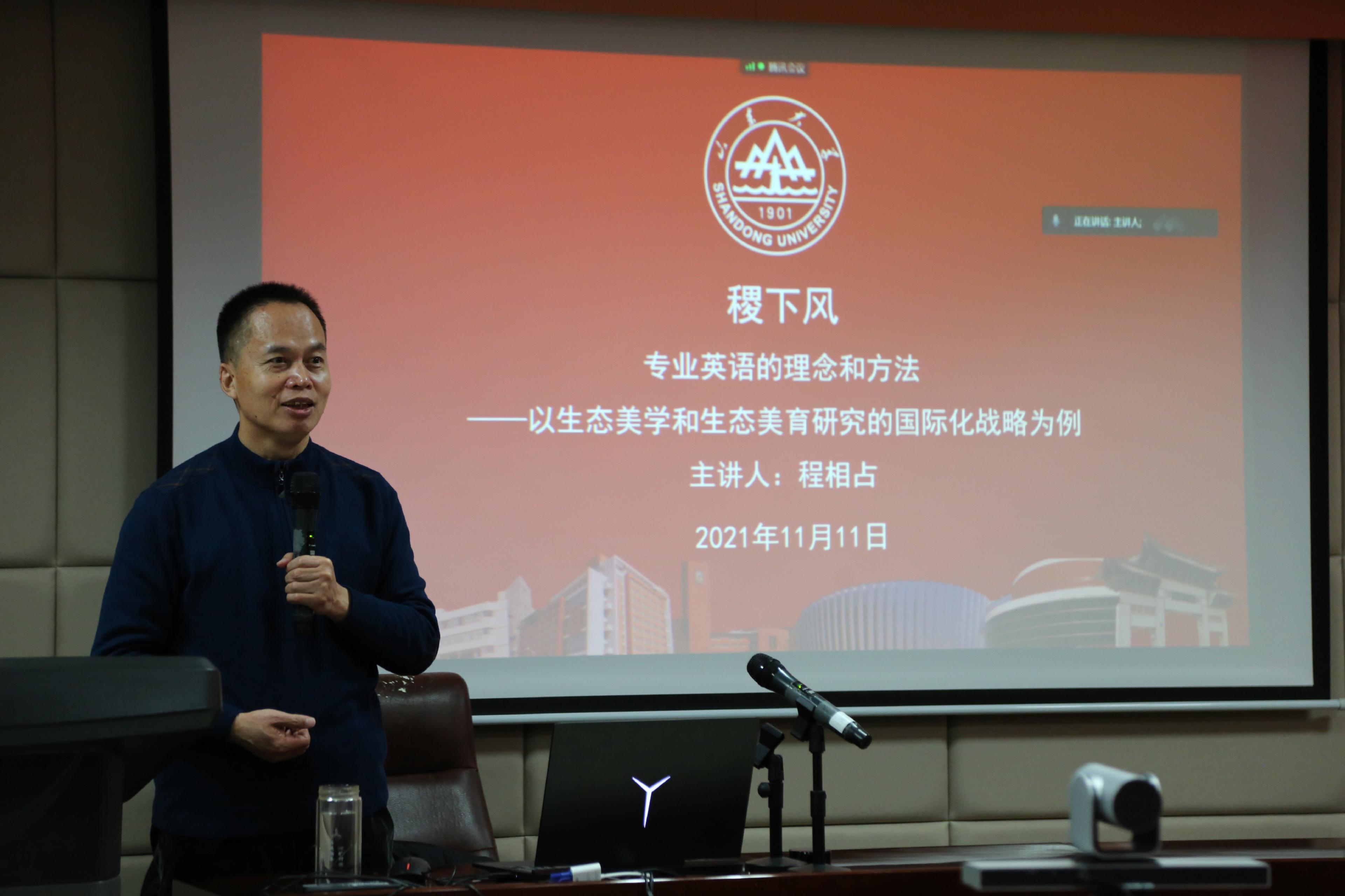 11月11日晚,248cc永利集团副院长、山东大学文艺美学研究中心副主任程相占教授做客第118期(总第1107期)“稷下风”研究生学术讲坛,于知新楼A620作题为“专业英语的理念和方法——以生态美学和生态美育研究的国际化战略为例”的讲座。本次讲座由文学院研究生会学术部副部长庞博主持,通过腾讯会议实时直播,吸引了校内外百余名师生参与。