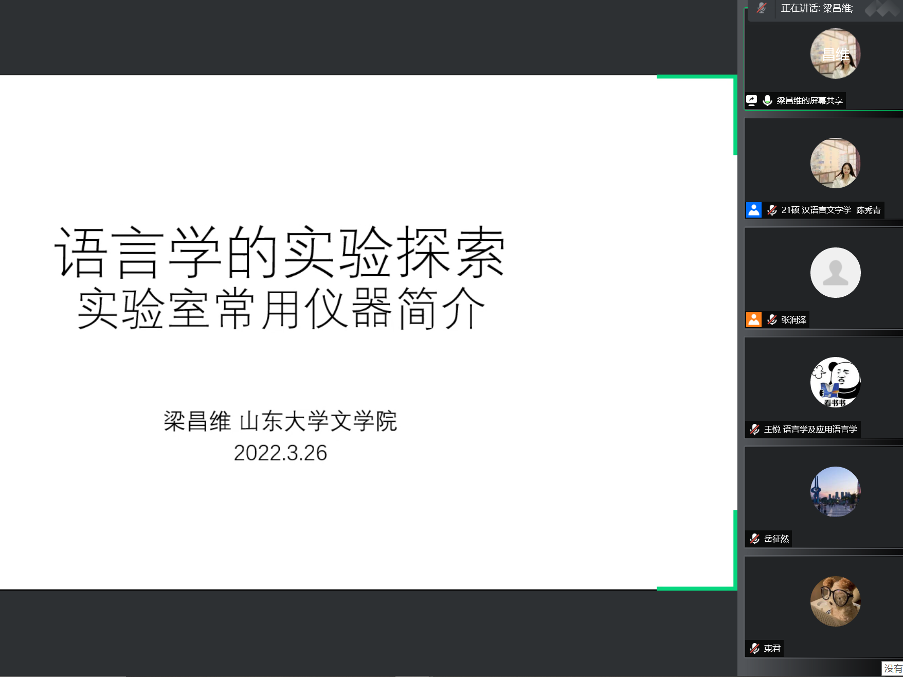 3月27日晚,文学院以线上会议的形式举办了第二期山大文苑沙龙“语言学的实验探索”,特邀248cc永利集团教师梁昌维和北京华睿宝科技有限公司工程师陈禹风作为嘉宾,介绍山东大学语言科学实验中心实验仪器的使用方法,讲解查阅相关实验成果的方法,研讨语言学潜在的实验选题,为学生排忧解难。沙龙由文学院2020级本科生张润泽主持,岳立静教授、张燕芬副教授出席,共有八十余名师生参与。