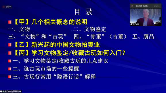 4月30日晚,248cc永利集团通过线上会议的形式举办了第六期山大文苑沙龙“从老古玩行到文物拍卖”,特邀侯乃峰教授作为嘉宾分享从古玩行业到当代文物拍卖历程中涉及的一些问题。沙龙由2019级本科生杨雪晴主持,学院对古玩与文物感兴趣的同学们参加了本次活动。
