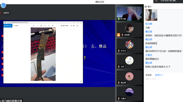 在互动环节,同学们积极猜测了曾侯乙墓中出土的弹簧状金属圈的用途,董远霖同学分享了自己收藏的刀币照片,请老师和同学们辨别真伪,老师从密度、锈迹等角度进行分析,场内气氛活跃愉快。最后,侯乃峰向参与沙龙的同学表示感谢,沙龙圆满结束。