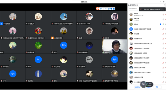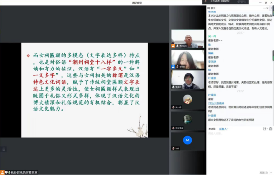 在讨论环节中,同学们或在腾讯会议聊天室积极提问,或直接打开话筒发言,气氛非常活跃。主讲人谢若秋对提问内容一一进行回答。此外,主讲人谢若秋与对话人霍婧雯以互问互答的方式探讨了两地女祠的成因、特点,比较了两地女祠的共同点和不同点。