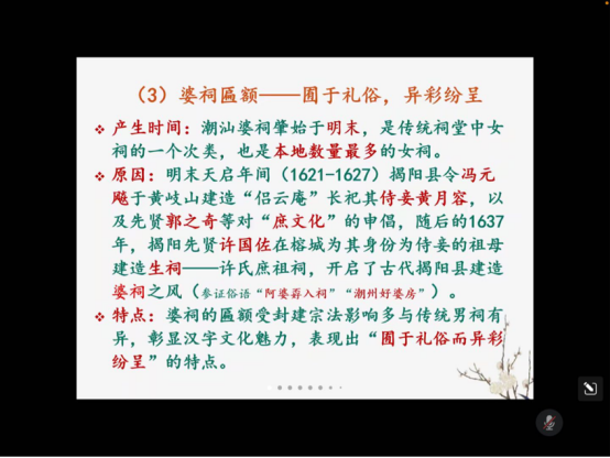 谢若秋从中国祠堂文化概述、潮汕传统祠堂、潮汕女祠匾额的多模态等方面对于潮汕祠堂匾额特点做了详尽的讲述,并且得出结论:在明清时代的潮汕地区,女祠尤其是婆祠的繁荣,是在传统孝道思想的推动下,随着明代中期封建宗法礼制“松绑”和社会经济的发展才出现的,在祠祭上表现为“分庭受礼”的特点,是对封建礼俗文化的挑战和突破。而其匾额的多模态特点,也是对俗语潮汕“祠堂十八样”的一个解读和有力的佐证。此外,谢若秋将女祠文化与汉语言文化联系起来,表示汉语以“一字多义”和“一义多字”赋予了传统祠堂匾额文字表达上更多的灵活性,使女祠匾额样式表现出既囿于礼俗又形式多样,体现了汉语文化的博大精深和礼俗规范的有机结合,彰显了汉语文化魅力。