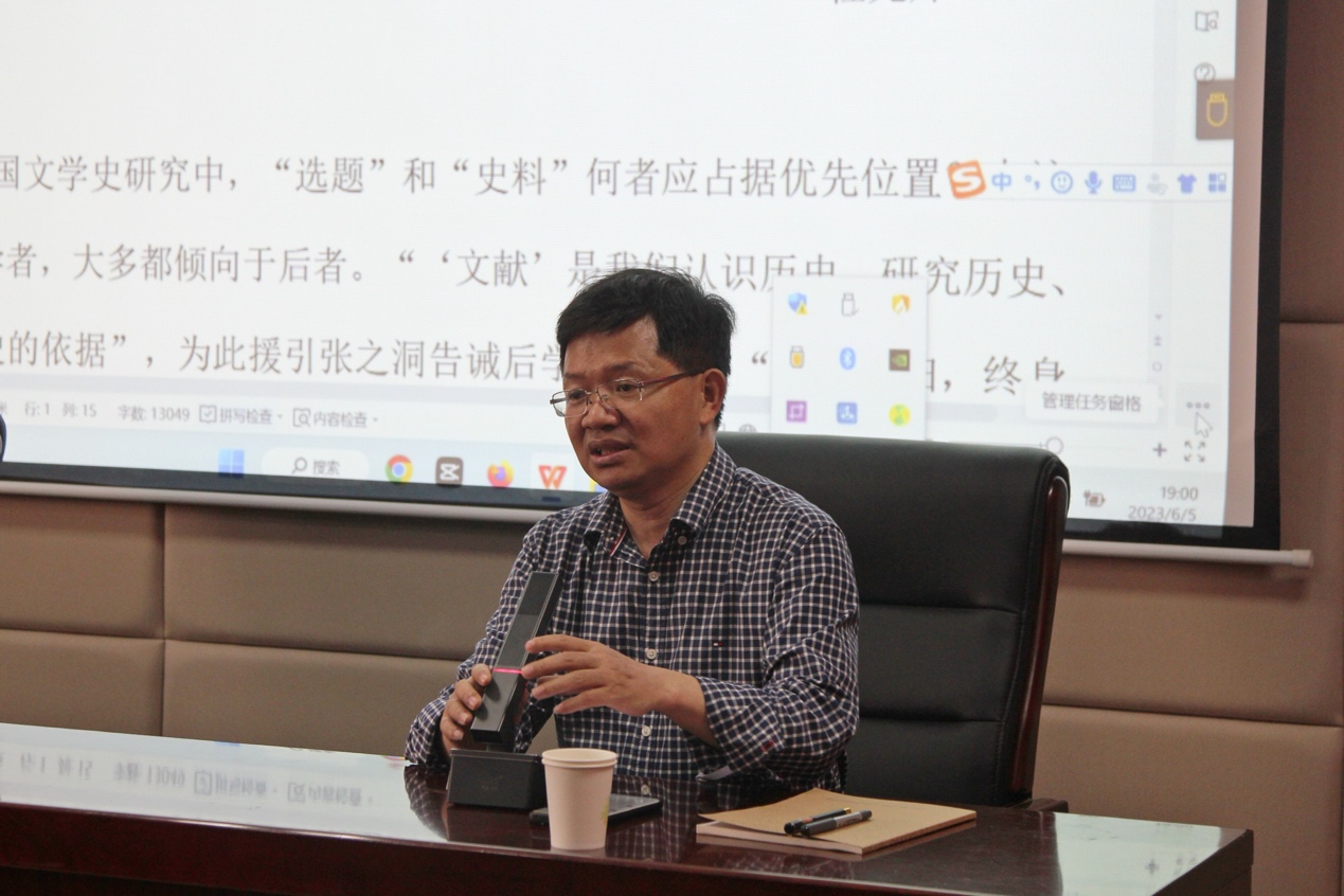 讲座伊始,黄发有教授向程光炜教授致欢迎辞,并向同学们介绍程光炜教授的学术成就。随后,程光炜以“在中国文学史研究中,‘选题’和‘史料’何者应占据优先位置”一问题切入讲座内容,旁征博引地强调了当代文学研究中“文献”的重要意义。提到当代文学的史学化转向后,程光炜以朱金顺、陈子善、解志熙几位先生为例,提出部分研究者看重从材料出发做选题,而有的方史学理论家则强调没有问题就不会有材料,他认为对研究生或做材料老师来说,不妨多听几家的看法。