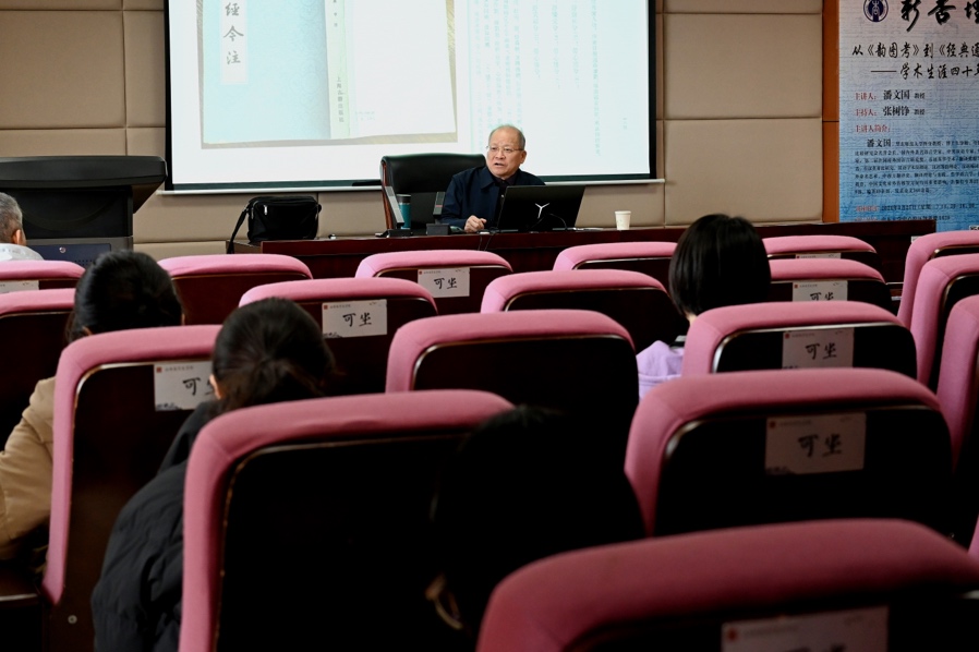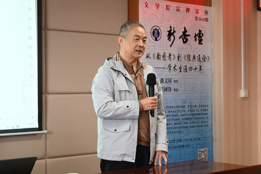 2024年3月27日下午2时,华东师范大学终身教授、中国英汉语比较研究会名誉会长潘文国教授做客第360期“新杏坛”,于知新楼A620室作了题为“从《韵图考》到《经典通诠》——学术生涯四十年”的学术讲座。讲座由张树铮教授主持,文学院党委书记郭春晓等出席,吸引了众多师生前来聆听。