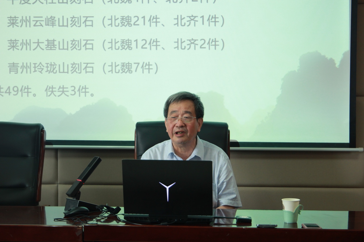 讲座伊始,郑训佐教授简要介绍了赖非研究员的治学领域和研究成果。赖非研究员历任山东石刻艺术博物馆研究员、山东博物馆研究馆员、山东省书法家协会副主席等职,长期从事田野考古与古代石刻研究,著有《云峰刻石调查与研究》(合著)《山东新出土古玺印(并释)》《书法环境—类型学》等书,发表学术论文百余篇。郑训佐教授提到,赖非研究员常用一副对联介绍自己的学术史:“一篇归纳,两篇划分”。介绍完毕之后,赖非研究员为大家进一步阐释了这副对联的含义。