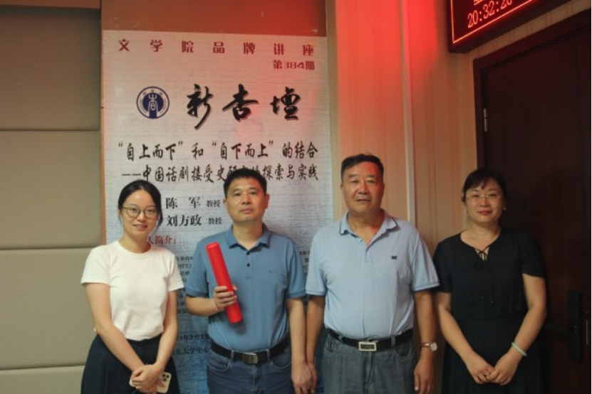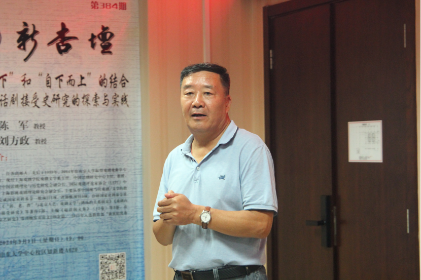9月1日晚19时,上海戏剧学院陈军教授做客第384期“新杏坛”,于知新楼A620室作了题为“‘自上而下’和‘自下而上’的结合——中国话剧接受史研究的探索与实践”的学术讲座。讲座由248cc永利集团现当代文学教研室刘方政教授主持,山东师范大学车晓宇老师、山东青年政治学院张倩老师出席,吸引了院内外众多师生前来聆听。