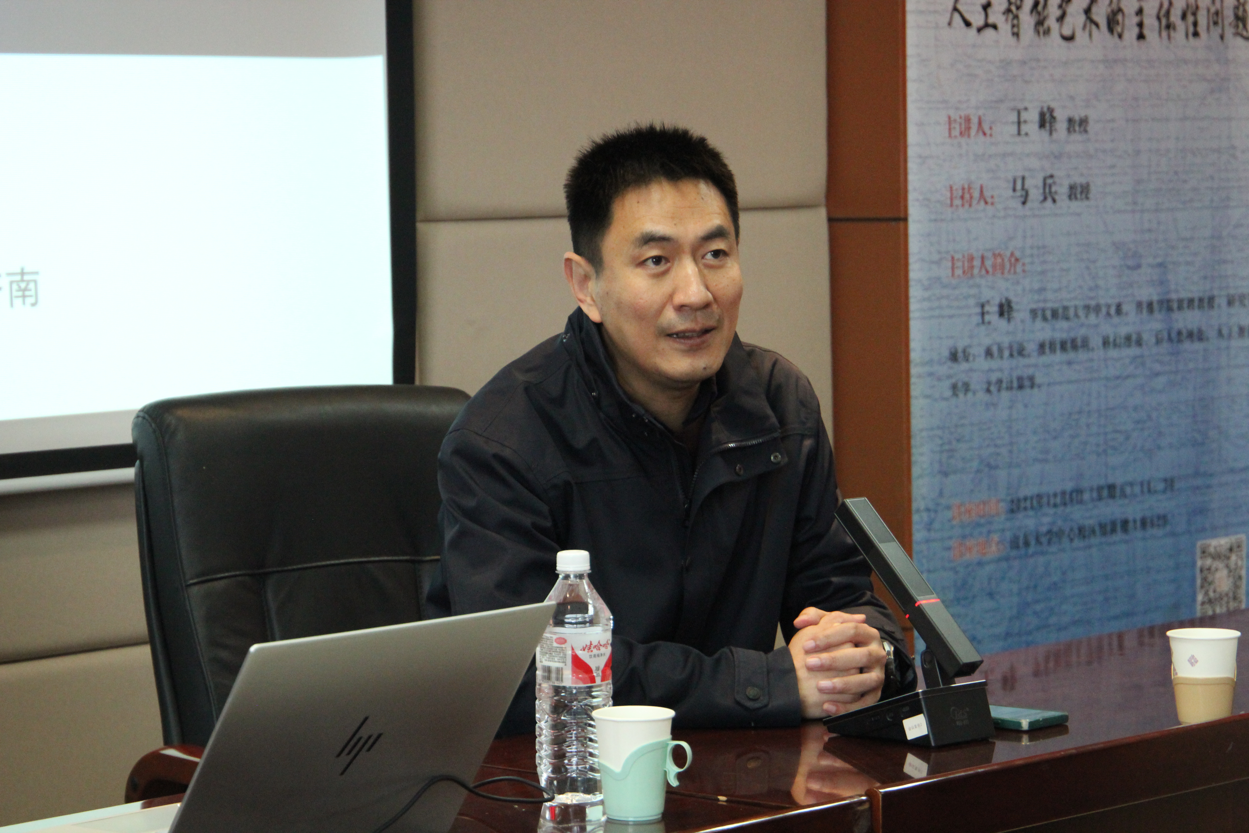 讲座伊始,马兵教授对王峰教授的到来表示热烈欢迎,并就其研究方向与学术成果进行简要介绍。王峰教授是华东师范大学中文系、传播学院联聘教授,兼任中国文艺理论学会秘书长、中国传播学会副会长等职务,研究领域为西方文论、维特根斯坦、科幻理论、后人类理论、人工智能美学、文学计算等,著有《西方阐释学美学局限研究》《意义诠释与未来时间维度》等,在学界具有广泛的影响力。