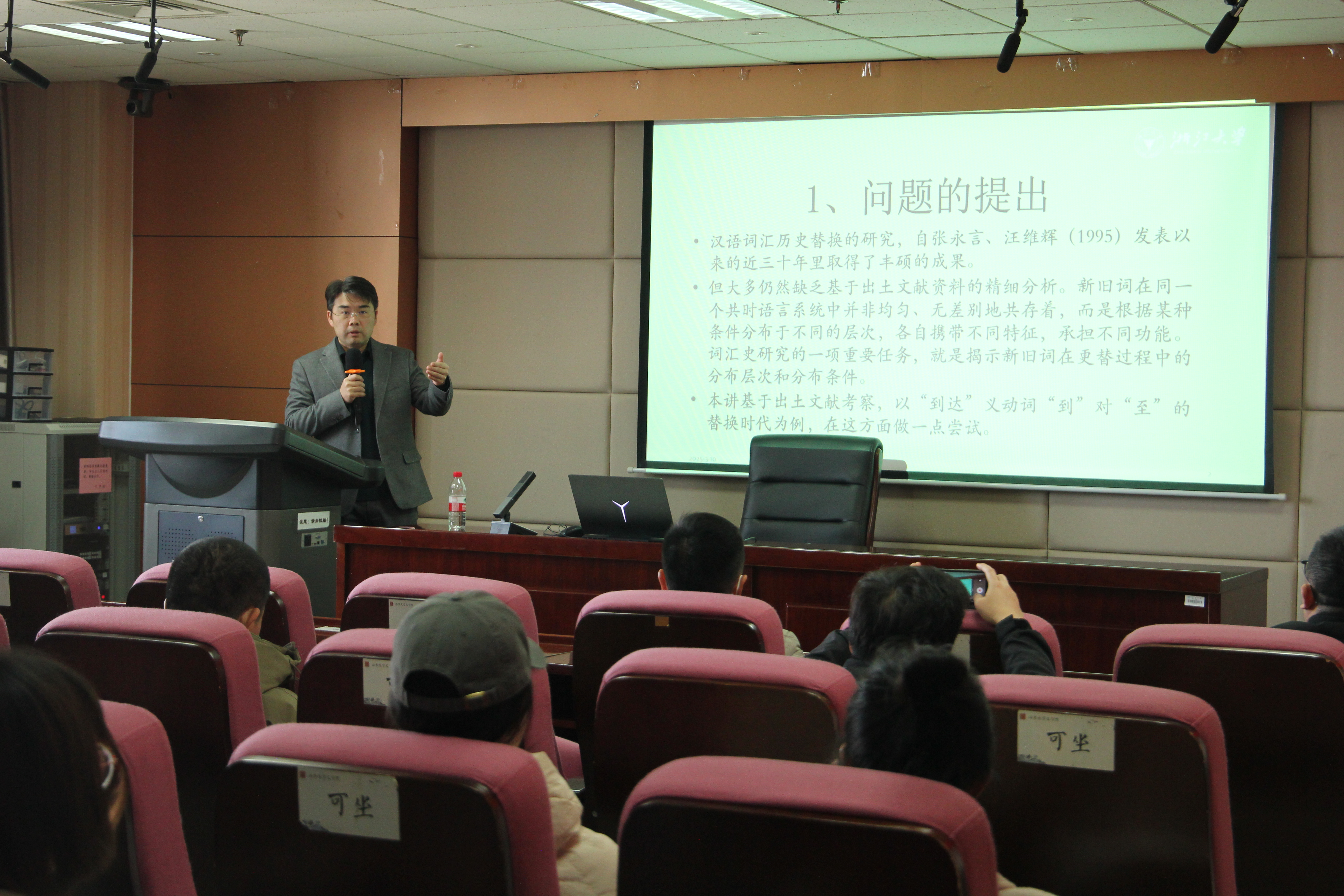 3月10日上午9时30分,浙江大学文学院教授、博士生导师史文磊教授做客第398期“新杏坛”,于知新楼A620教室作题为“词汇更替中的分布层次与分布条件”的学术讲座。讲座由刘祖国教授主持,王辉教授出席,吸引了数十名师生前来聆听。