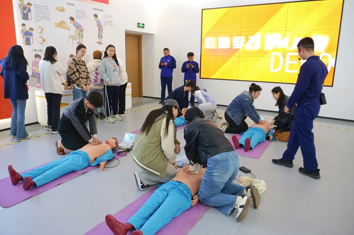 体验为要,掌握技能。基地内八大展区设置了丰富的体验环节,师生们踊跃投身其中以提升防灾减灾能力。在灭火演练区,参访同学与AI接警员对话,并利用VR技术模拟在厨房、办公室等不同环境灭火的步骤,掌握了针对不同类型火灾正确选择灭火器的知识。同学们还在消防员的指引下,学习逃生绳结打结步骤,并利用楼房模型练习绳索速降技巧。在多样仿真的体验互动中,师生们真切感受到每一场火灾事故的突发性、紧迫性、复杂性,提升了应对险情的自救自护本领。