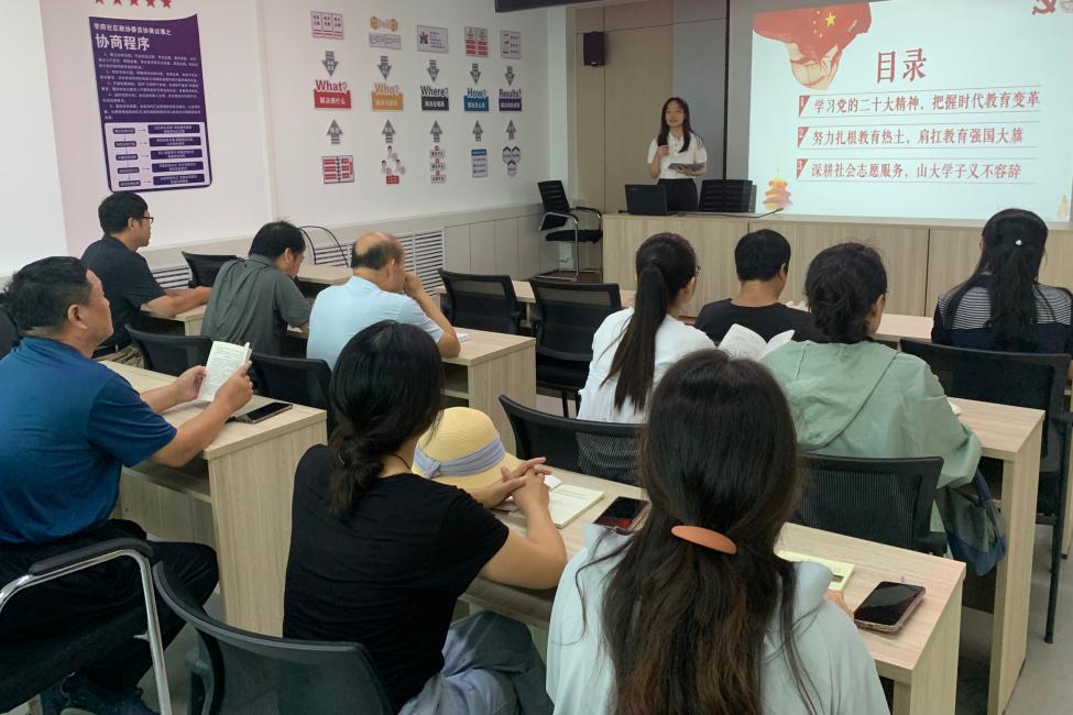 团队组队科学,思政素养扎实,成员囊括248cc永利集团优秀党团员代表。在文学院本科生党支部的引导下,团队成员集中学习了党的二十大精神,结合当下大学生志愿服务与社区教育结合的时事热点,选取了党的二十大精神中的“教育兴国”部分作为宣讲主题。经过为期四个月的筹备时间,打磨出了万字宣讲稿和宣讲PPT。宣讲内容主要从三个部分展开,第一部分是“学习党的二十大精神,把握时代教育变革”,第二部分是“努力扎根教育热土,肩扛教育强国大旗”,第三部分是“深耕社会志愿服务,山大学子义不容辞”,围绕着精神学习、政策响应、学生贡献三个部分阐述了教育的重要性和党员发挥榜样模范作用的必要性,以青年话语讲述青年实践,用青年担当诠释党的二十大精神。