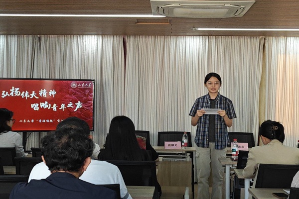 随后,山东大学“青语领航”宣讲团队长、文学院硕士生第一党支部副书记崔颖戈,以“精神谱系铸丰碑 抗战烽火淬英魂”为主题进行宣讲。她从历史脉络、文化抗战、青年担当三个维度,生动讲述了中华儿女众志成城、浴血奋战的英雄事迹,深刻解读了伟大抗战精神的时代内涵。宣讲既有历史厚度,又有现实温度,让在场党员同志深受触动。