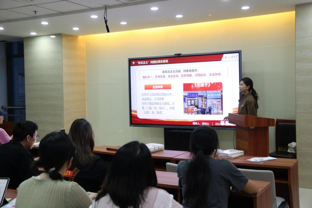 接下来支部四位同志依次上台分享学习心得并进行领读。组织委员王晴同志以“深入学习中央八项规定,强作风促发展”为主题,向在场同志介绍了《十八届中央政治局关于改进工作作风密切联系群众的八项规定》学习读本、《习近平关于加强党的作风建设论述摘编》和《强信心,促发展》三本书籍,并强调了坚决落实中央八项规定精神的重要意义;紧接着张如心同志就如何落实“中央八项规定”的主题继续深入,结合生动实例,详细辨析了中央八项规定精神与中央八项规定的关系、中央八项规定精神的实质与核心、违反中央八项规定精神的具体表现。两位同志的讲解将中央八项规定与日常学习工作紧密结合,并号召党员同志们规范行为、端正作风,提升效率与自律意识,共同营造风清气正的氛围,促进高质量发展。